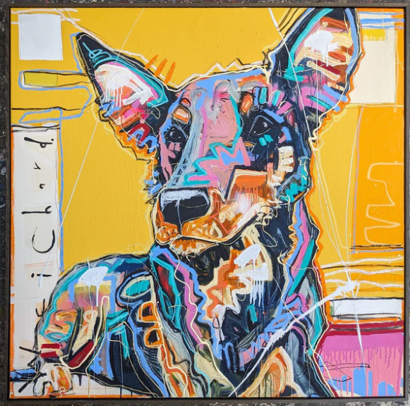 124 x 124cm. Acrylic, spray paint and enamel on canvas, framed in Oak.