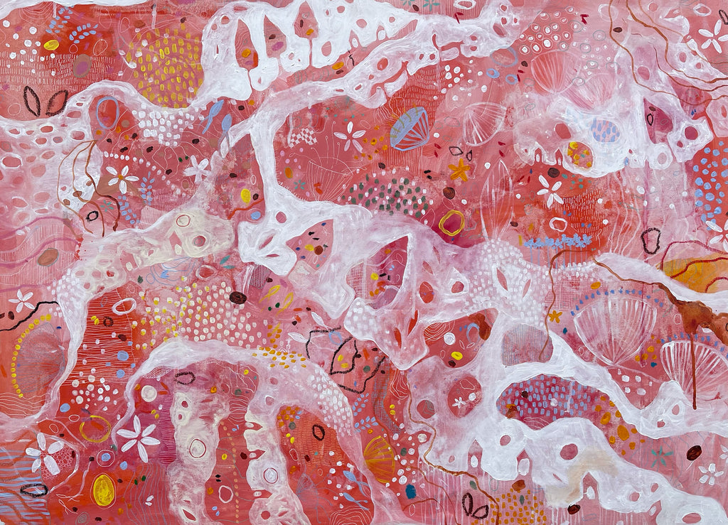 I have always painted but it was only since having my two children that I felt my inhibitions dissolve enough to show my work to others. Since then I have evolved my work predominantly working in the same style I have been working in since high school. My intuitive style of painting often includes bold colours and layers to reveal the story of my work through the use of pattern. I do this by applying a layer of paint over the colour in varying intensity and embellishing with intricate patterns. I often include strange little creatures and hidden layers in my paintings and my children always make their mark which I include in the finished painting.