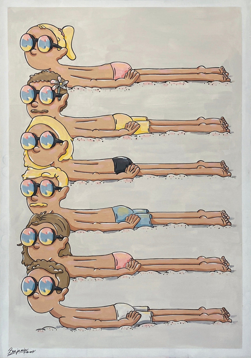 In 2019, Ben commenced his artistic journey following an extensive period in the construction industry. Ben experienced severe depression and sought an escape, leading him to embark on a surf trip to Mexico. It was during this trip that Ben discovered a profound appreciation for the vibrant pastel hues showcased in each of his designs. Subsequently, Ben dedicated himself to depicting themes of summer, love, and happiness in his artwork. His intention is to captivate viewers, allowing them to momentarily lose themselves within his pieces as a temporary respite from the burdens of life.