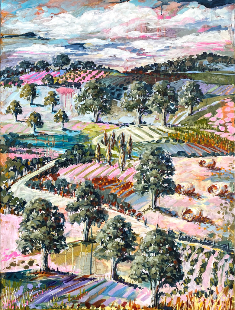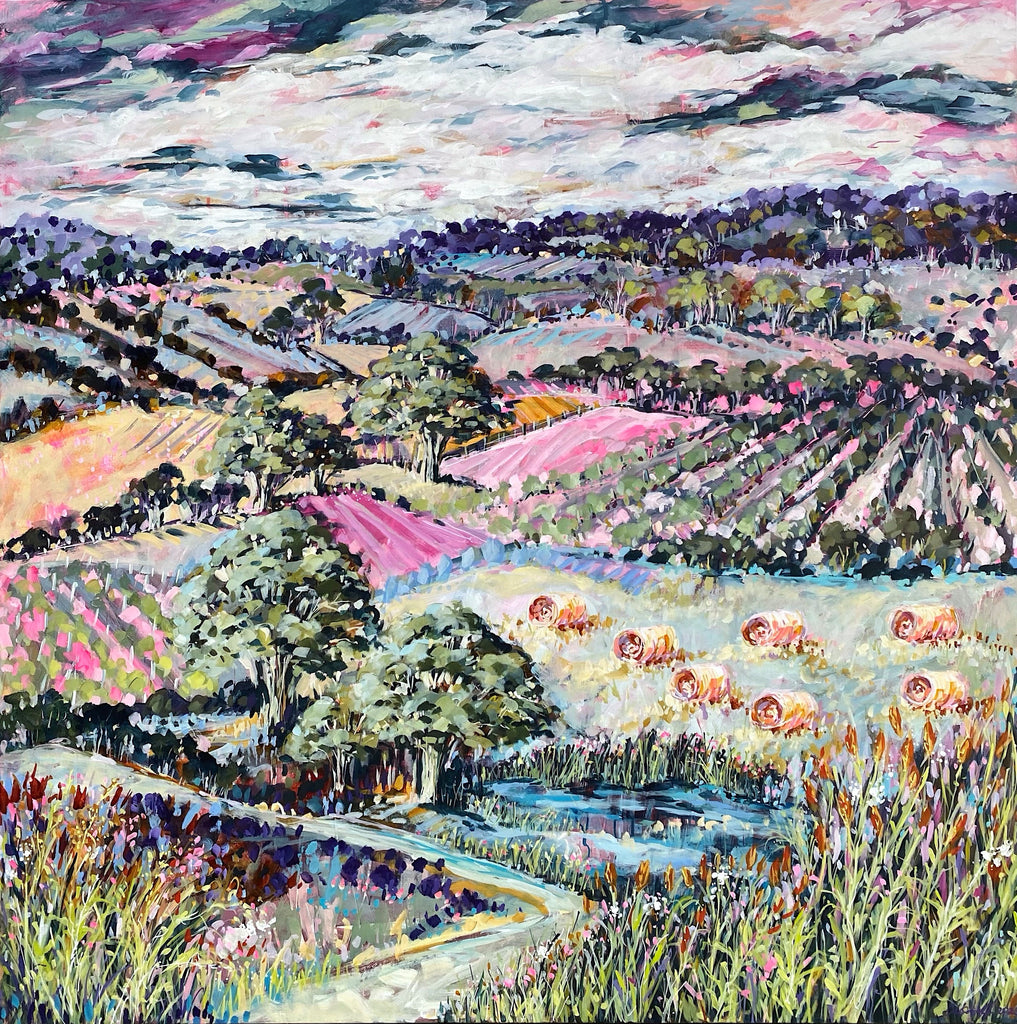 Cathy Usatoff is based in Melbourne, Victoria, has a degree in Fine Art from Royal Melbourne Institute of Technology as well as Teaching and Visual Merchandising qualifications and has been painting landscapes since 2019. Inspired by the diversity of the landscapes on the Mornington Peninsula in Victoria she paints with rich pallets of bold, vibrant colour the beautiful vistas of the wineries, rural paddocks and Australian coastal bush.