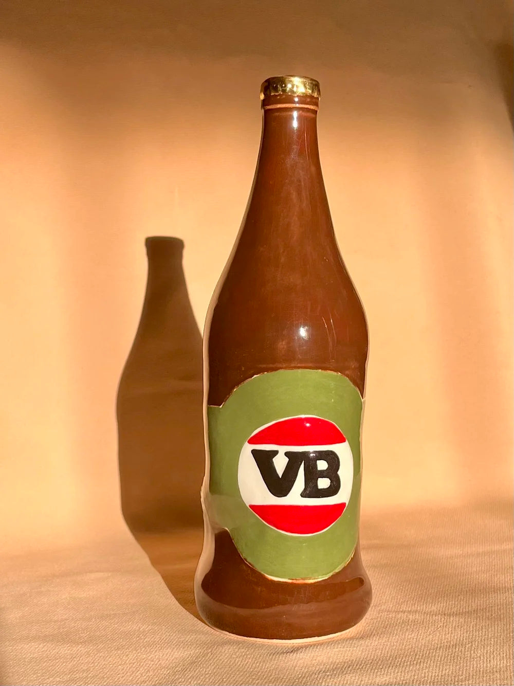 Approximately 24cmH. Glazed ceramic, hand painted detailing, gold lustre and hand squished.