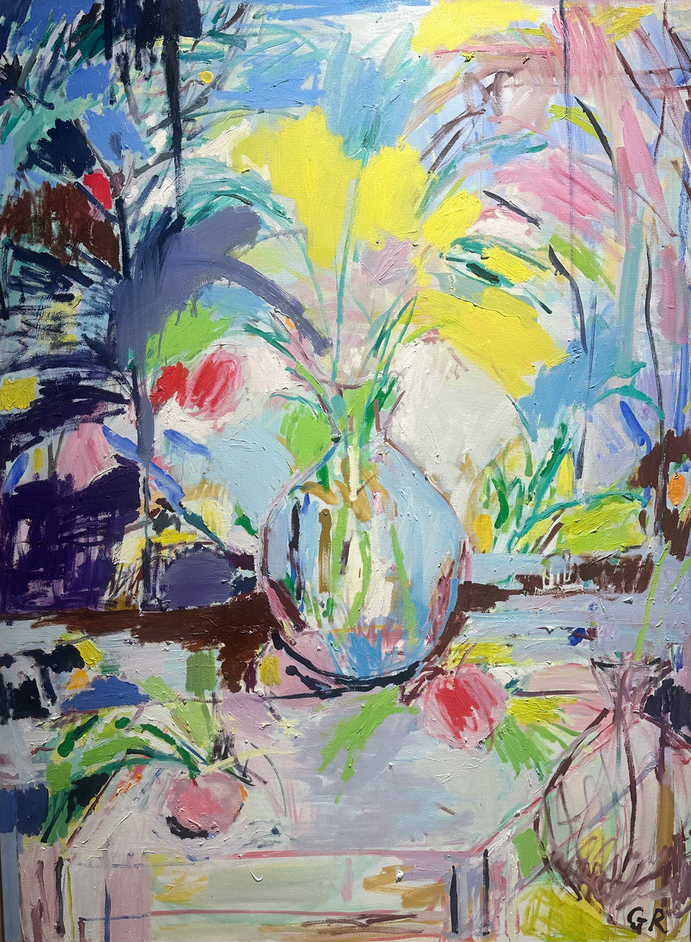 Gugge paints expressive floral still life and her colors are vibrant and bright. There is a great sense of life and inner wilderness in her way of painting. Alongside oil painting, Gugge also works with collage and ceramics. Her work is represented in different well renowned galleries.