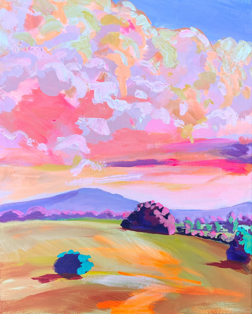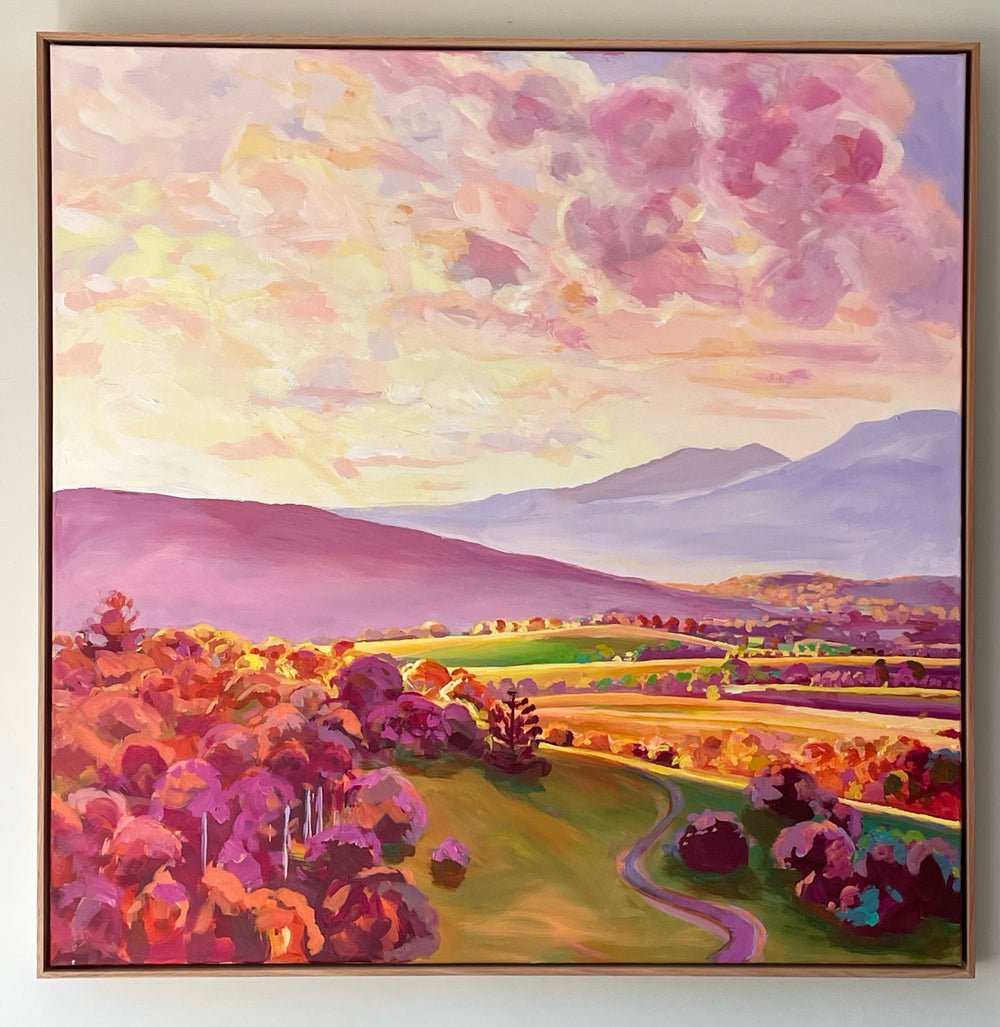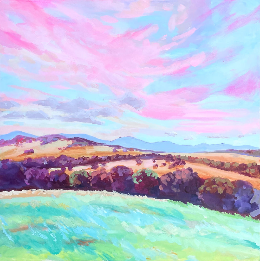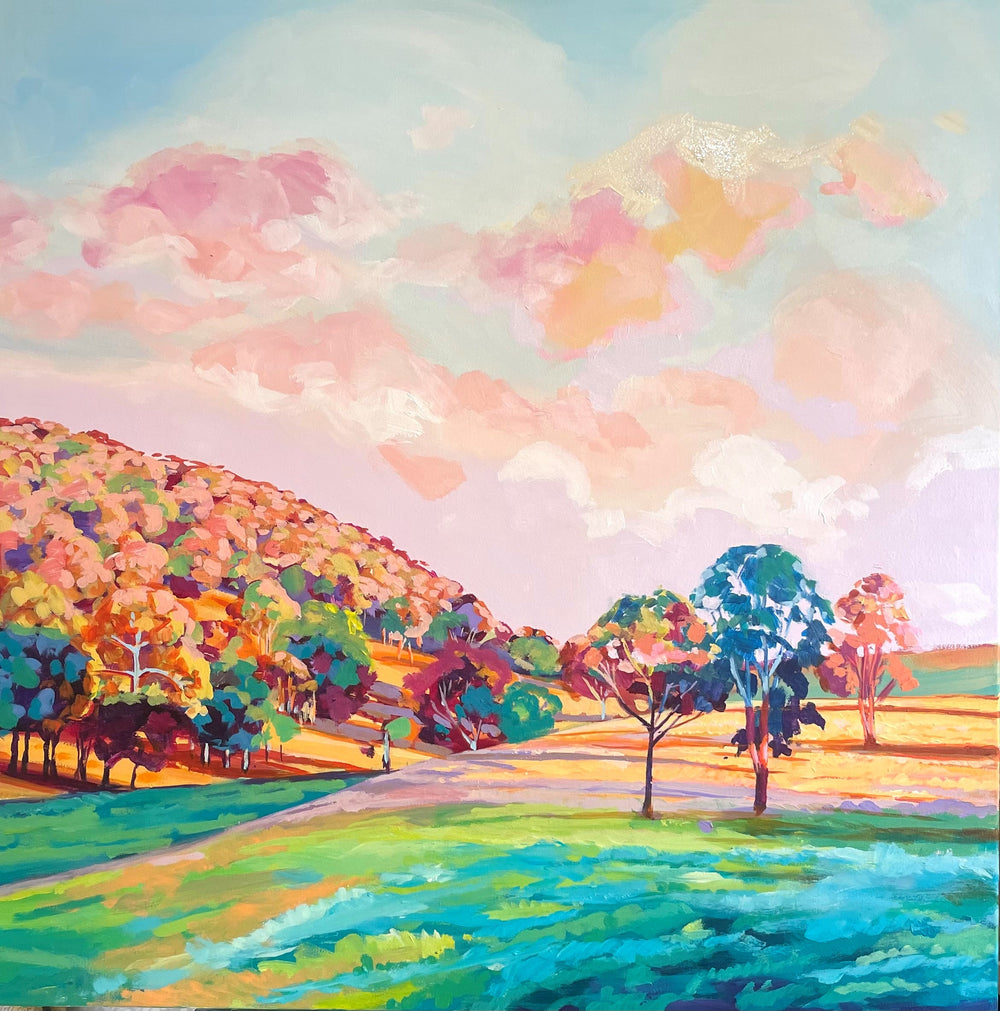 I love to capture sunlight in different moments and create hyper coloured landscapes. Nature provides these illuminating colours, I just like to instinctively paint them in a light of warmth. Sometimes I instantly know the colours, sometimes I’m searching for that colour harmony that makes the canvas sing what I am feeling. It is like using a language I had not known I knew. The result is rather whimsical and dream-like, but there is a true authenticity in the way light falls to the paintings and makes a powerful statement.