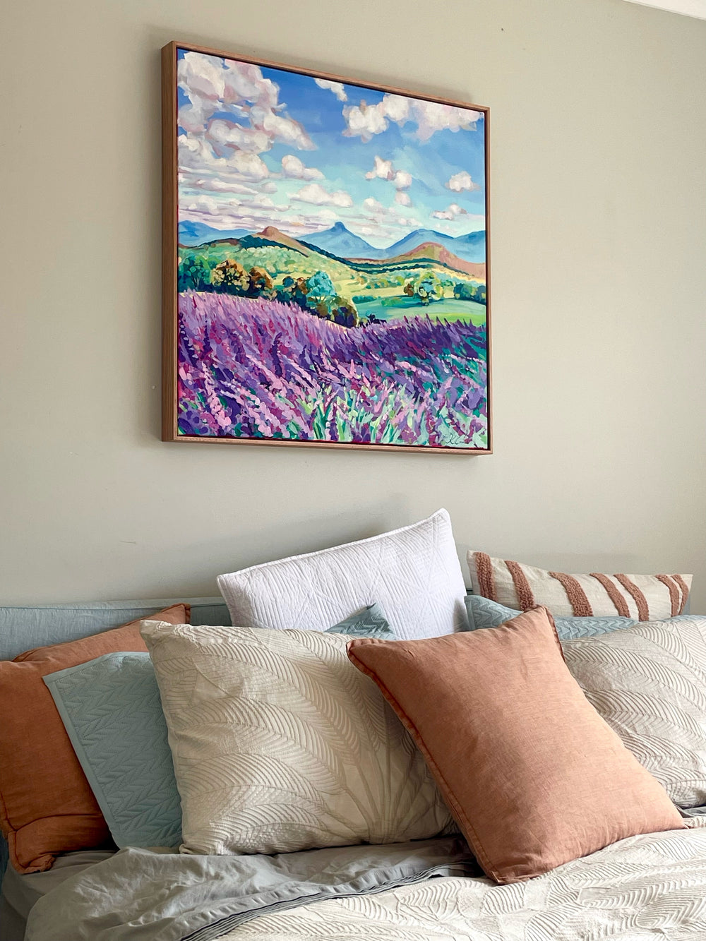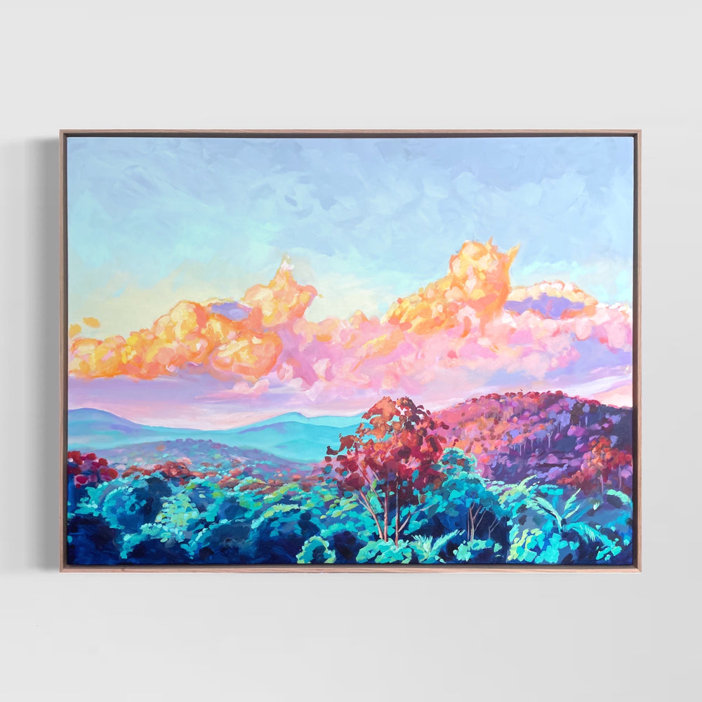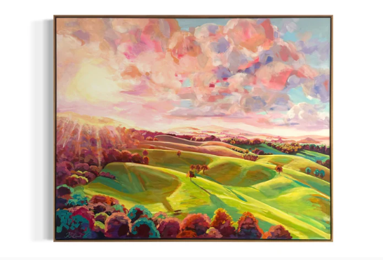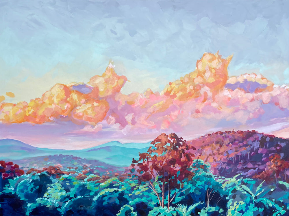 I love to capture sunlight in different moments and create hyper coloured landscapes. Nature provides these illuminating colours, I just like to instinctively paint them in a light of warmth. Sometimes I instantly know the colours, sometimes I’m searching for that colour harmony that makes the canvas sing what I am feeling. It is like using a language I had not known I knew. The result is rather whimsical and dream-like, but there is a true authenticity in the way light falls to the paintings and makes a powerful statement.