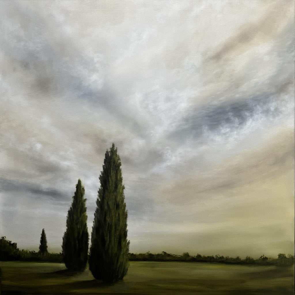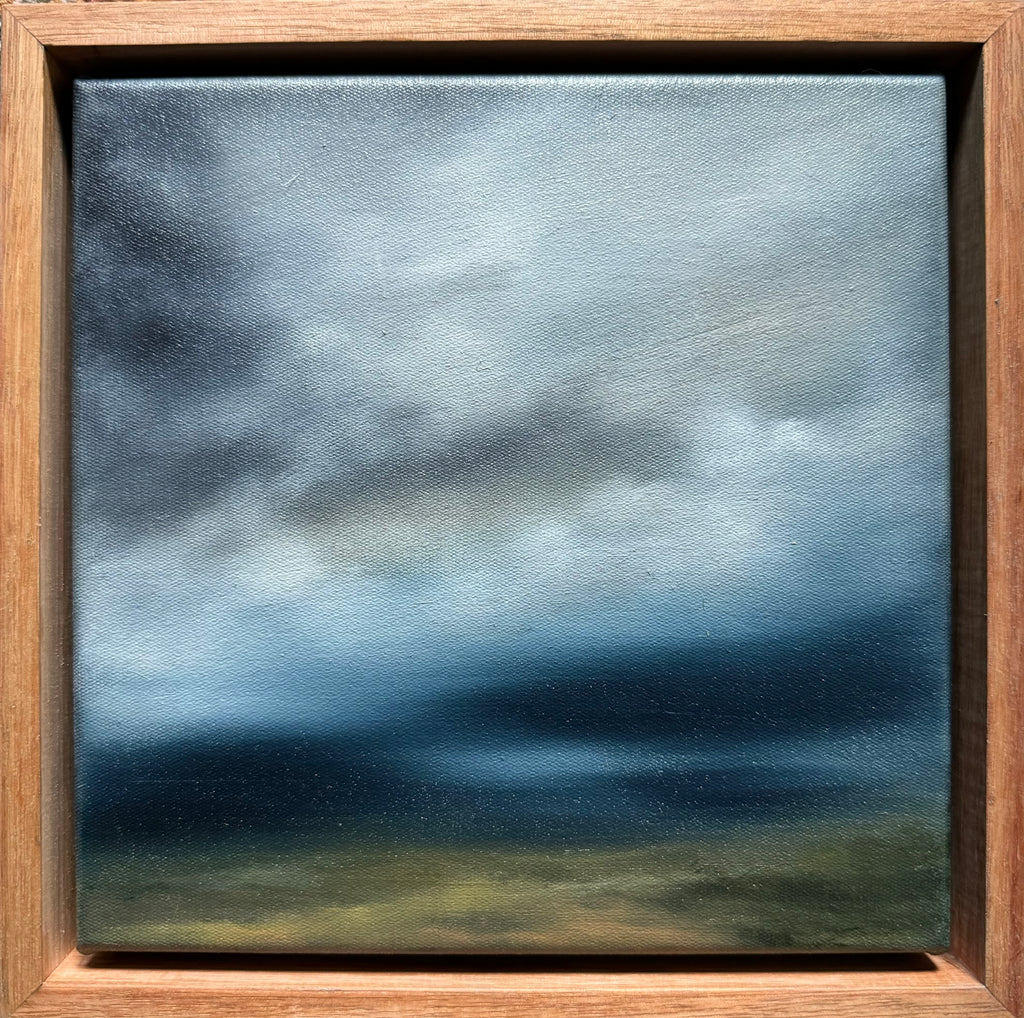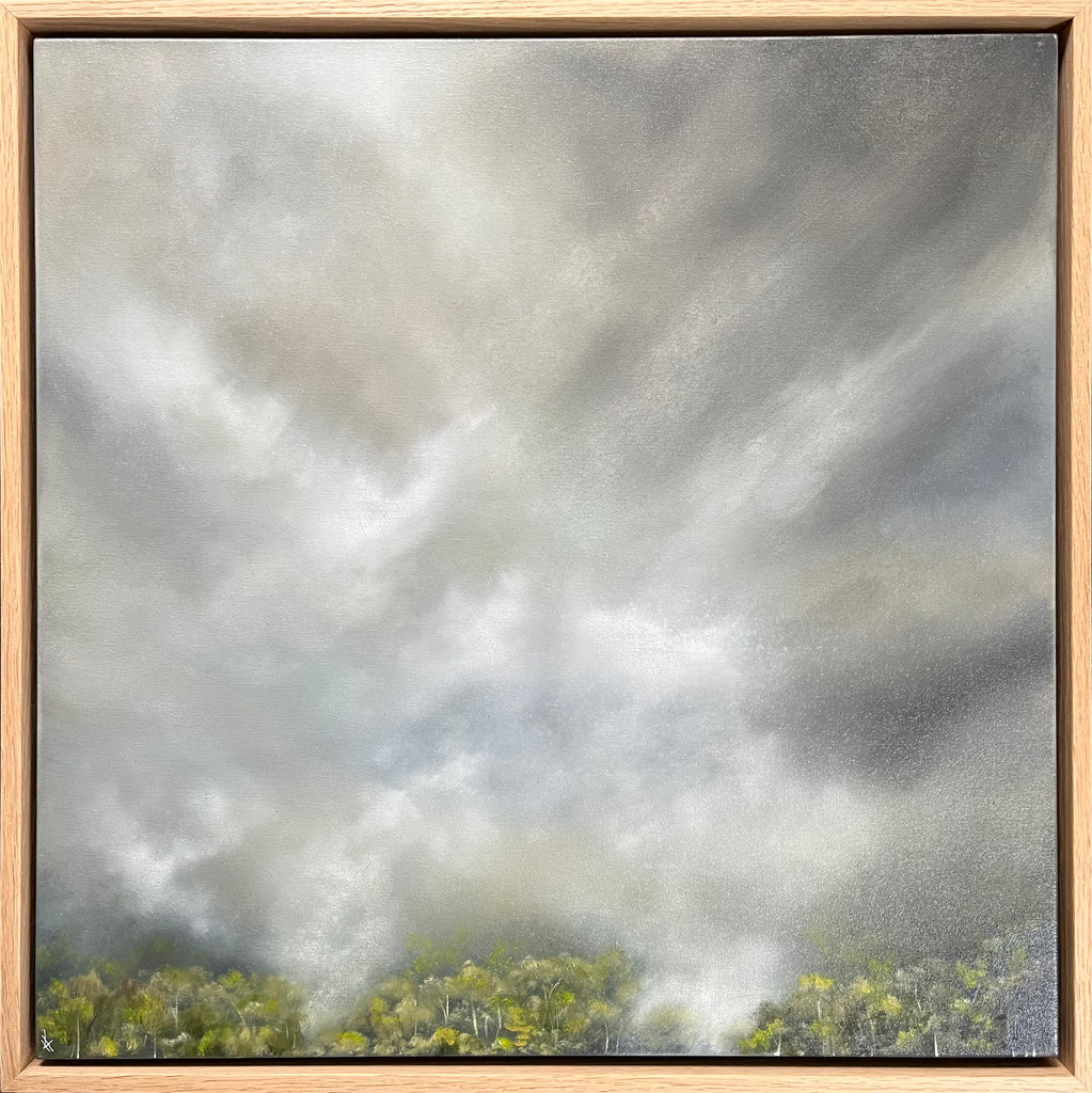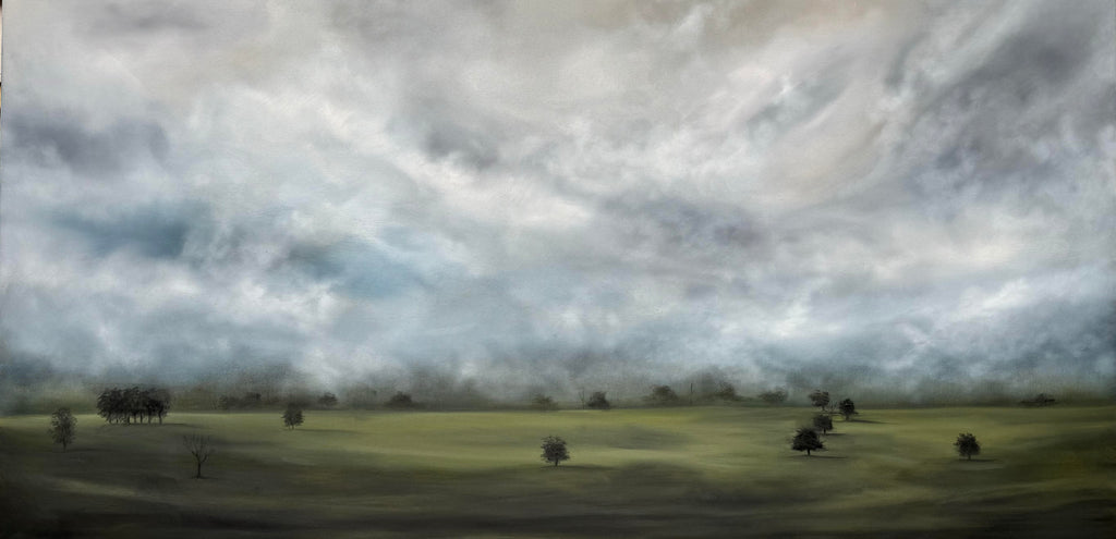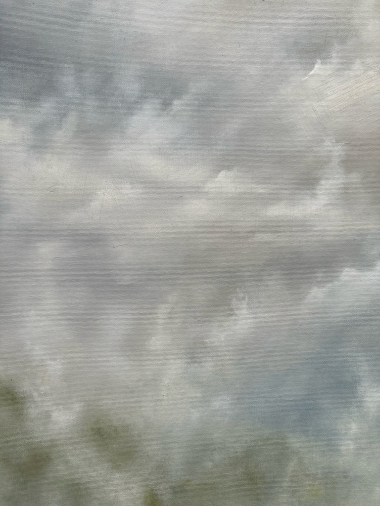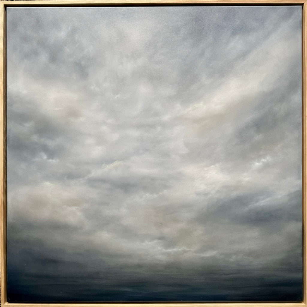 In the early phase of the painting process, Kelly selects a number of colours to form her foundational base and applies them directly to the surface of the canvas. Painting principally in oils, with occasional details produced in watercolours and pastels, her landscapes are constructed over many layers and in muted palettes, as a means to describe shifts in weather patterns and environmental facets. While periodically creating works alla prima, most scapes are completed over the course of several weeks, as layers are provided the time to dry, emerge and be added to.