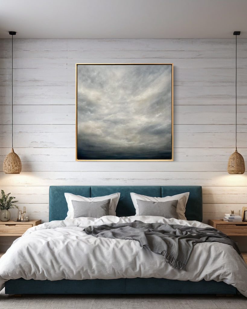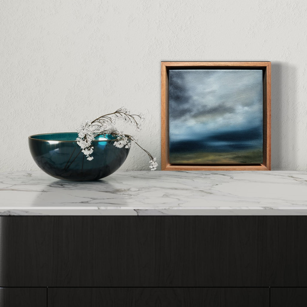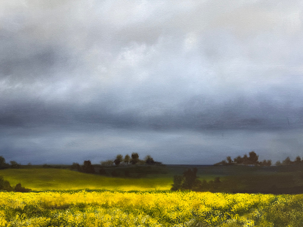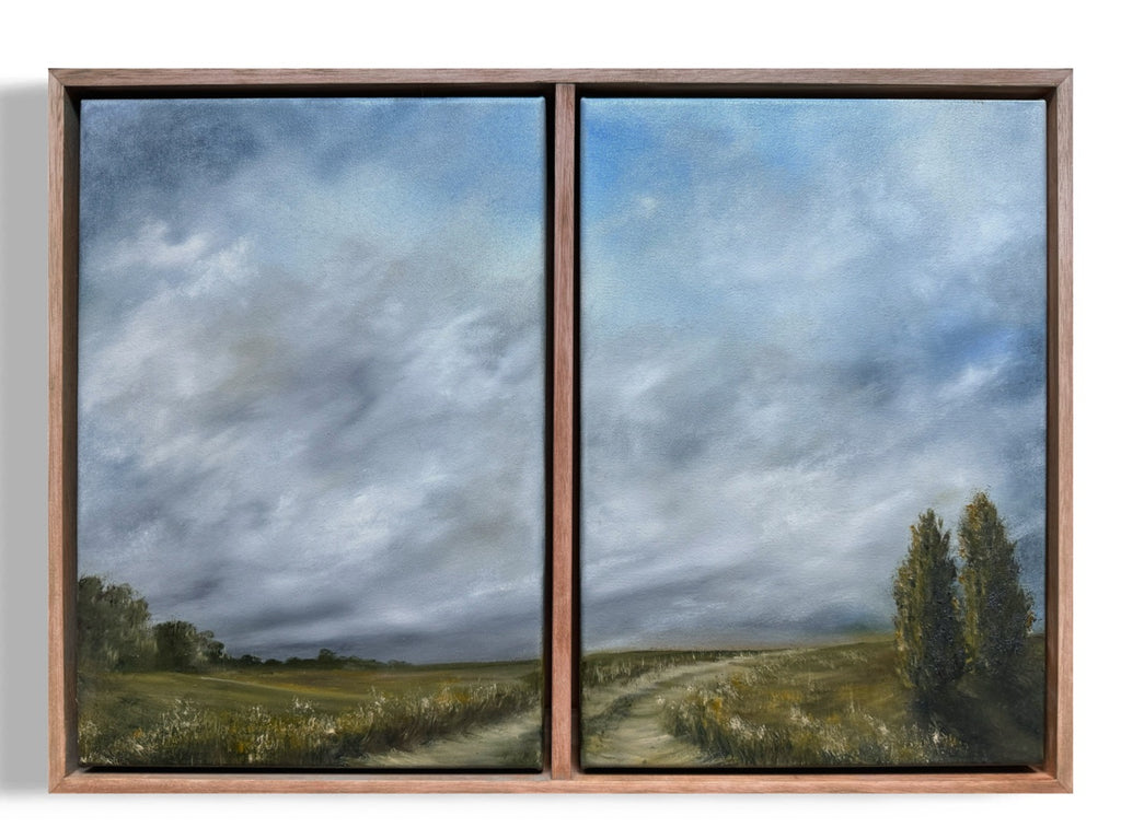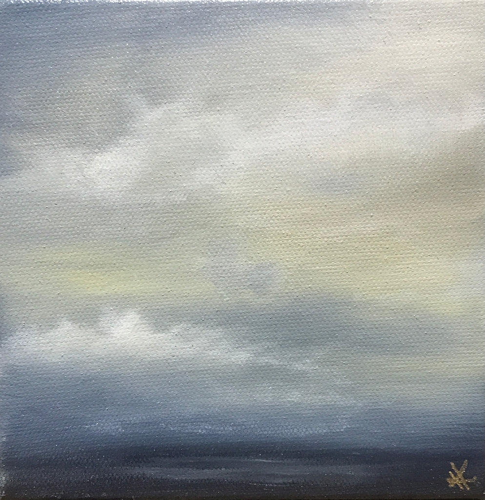 In the early phase of the painting process, Kelly selects a number of colours to form her foundational base and applies them directly to the surface of the canvas. Painting principally in oils, with occasional details produced in watercolours and pastels, her landscapes are constructed over many layers and in muted palettes, as a means to describe shifts in weather patterns and environmental facets. While periodically creating works alla prima, most scapes are completed over the course of several weeks, as layers are provided the time to dry, emerge and be added to.