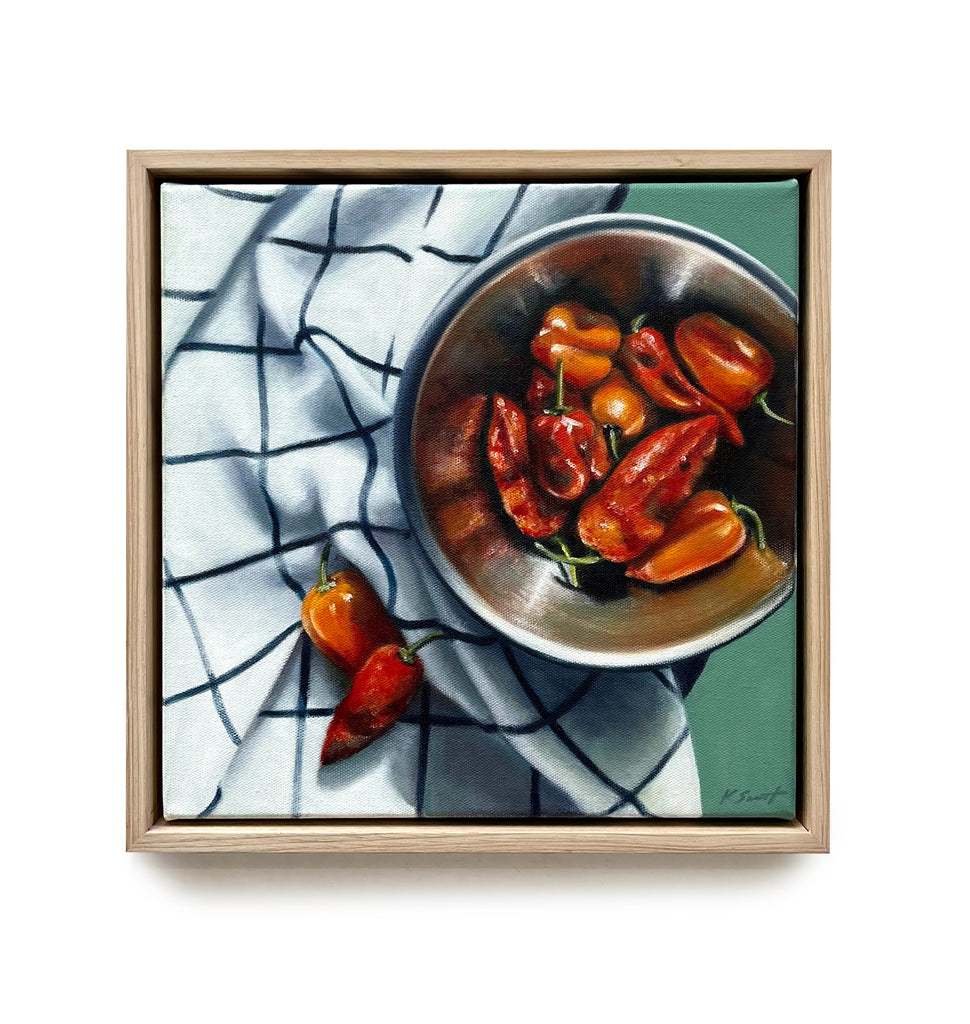 As an artist, Kylie Sirett draws her inspiration for her still life works from her immediate surroundings.; from items in her everyday life. Whether it be readily available to produce, household items, or pieces from her vintage kitchen collection. The everyday. It's accessible.