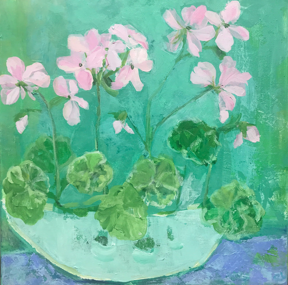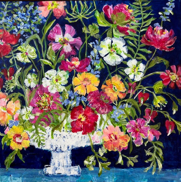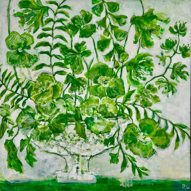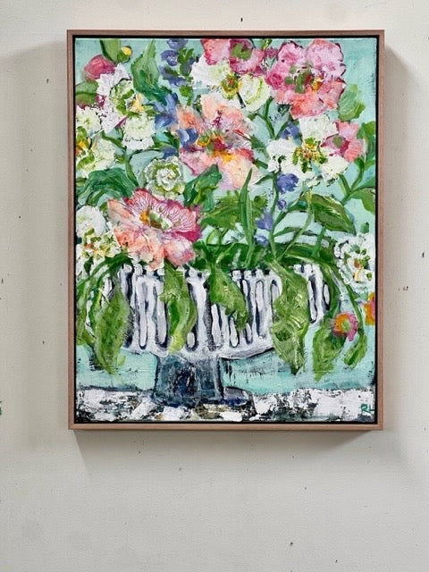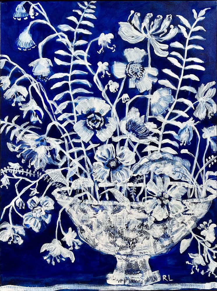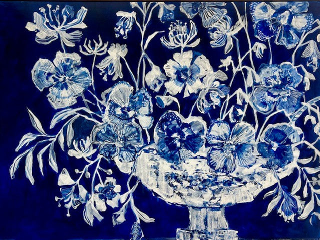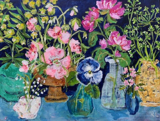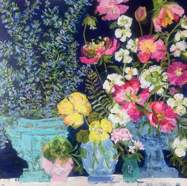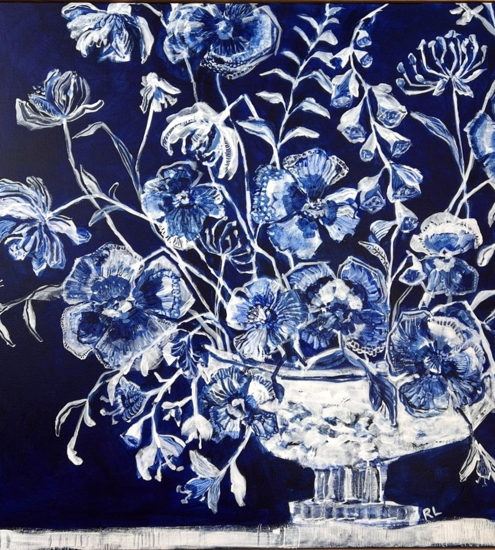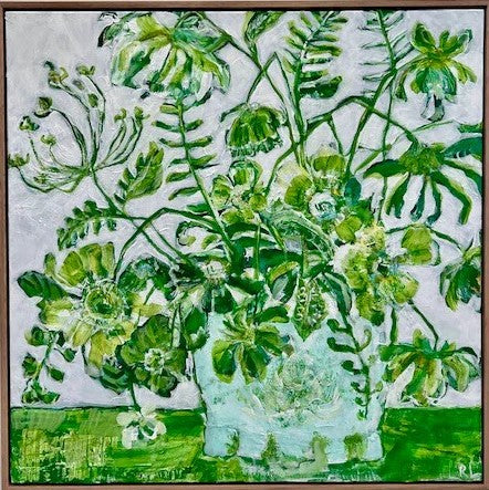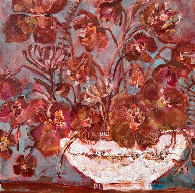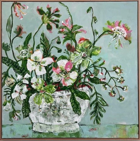 It’s all about colour and flower therapy for me! I have a lovely connection to my garden. I’m in and out often and can look back through floor to ceiling windows at what I’m painting while pottering in my natural space. I studied visual arts over thirty years ago. My art practice moved to working and teaching in ceramics studios. My love for foliage and flowers continued and I moved into florist mode for 10years. Happily I’ve been back painting for the past four years.  I paint floral abstracts because I love building layers of illuminated acrylic colours. The vessels are gently textured and layered with shades of colour poking through.