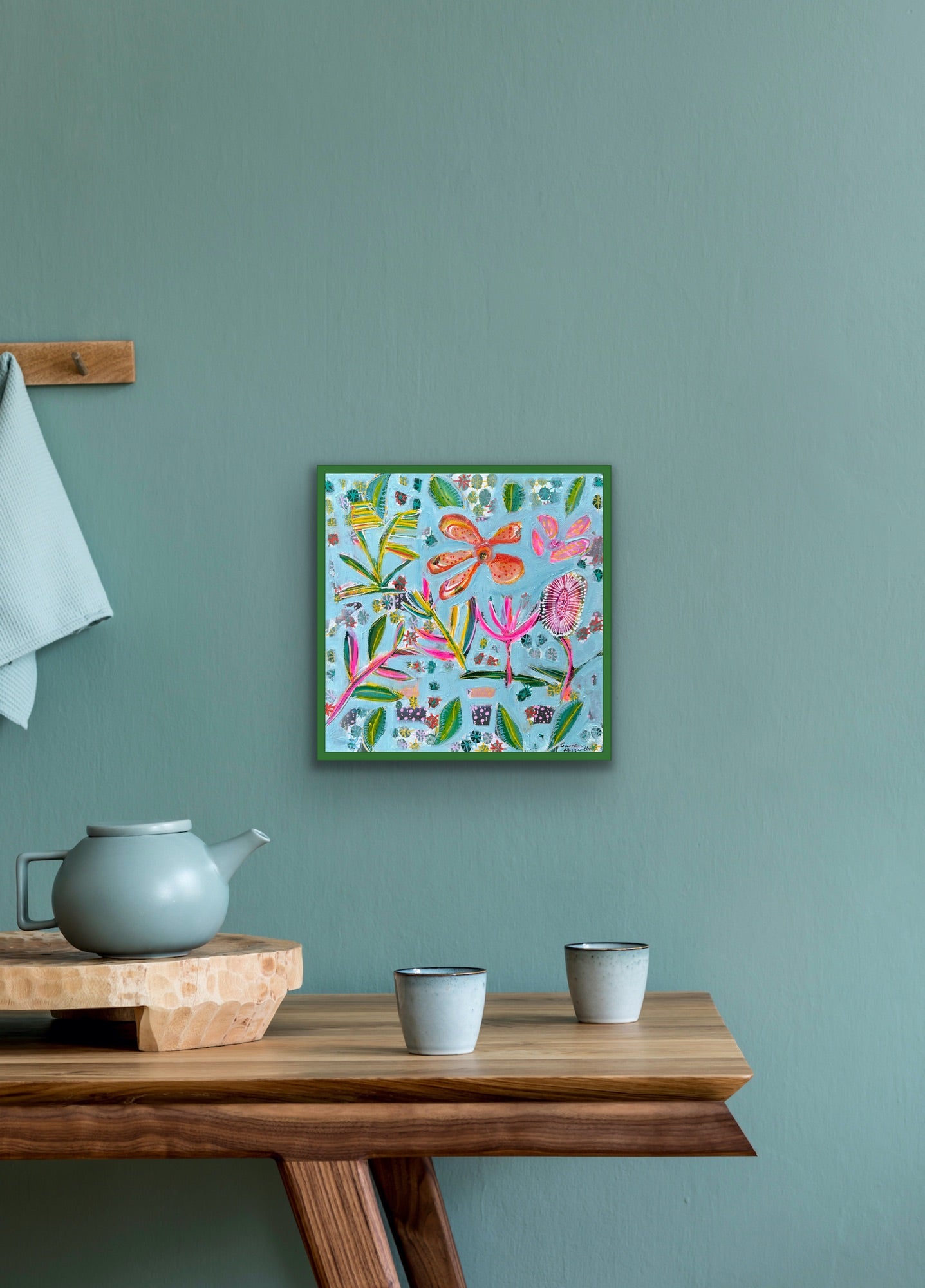 32.5 x 32.5cm. Acrylic on canvas, framed in Bayleaf green wooden box.