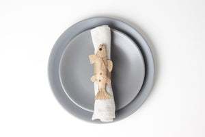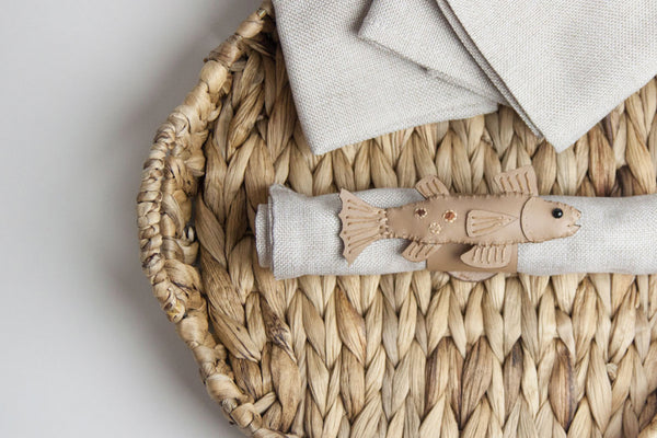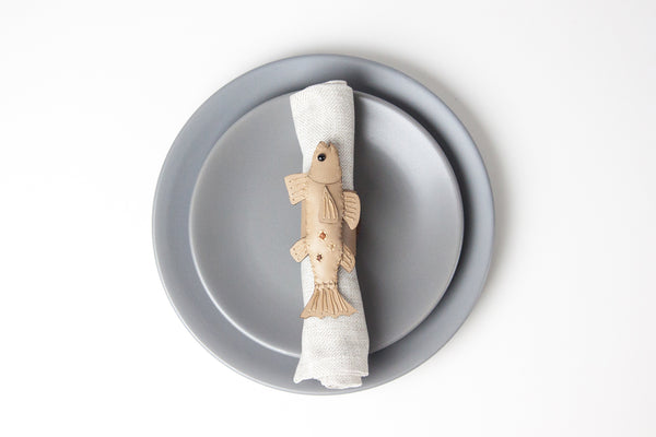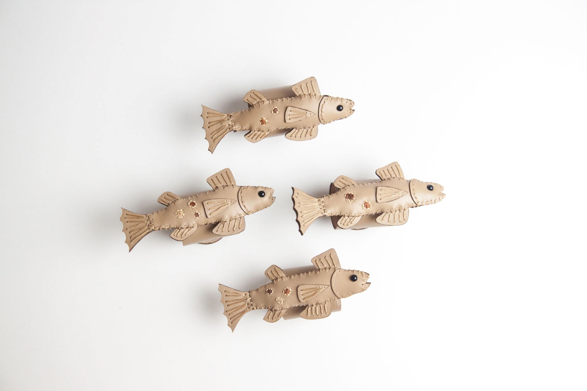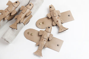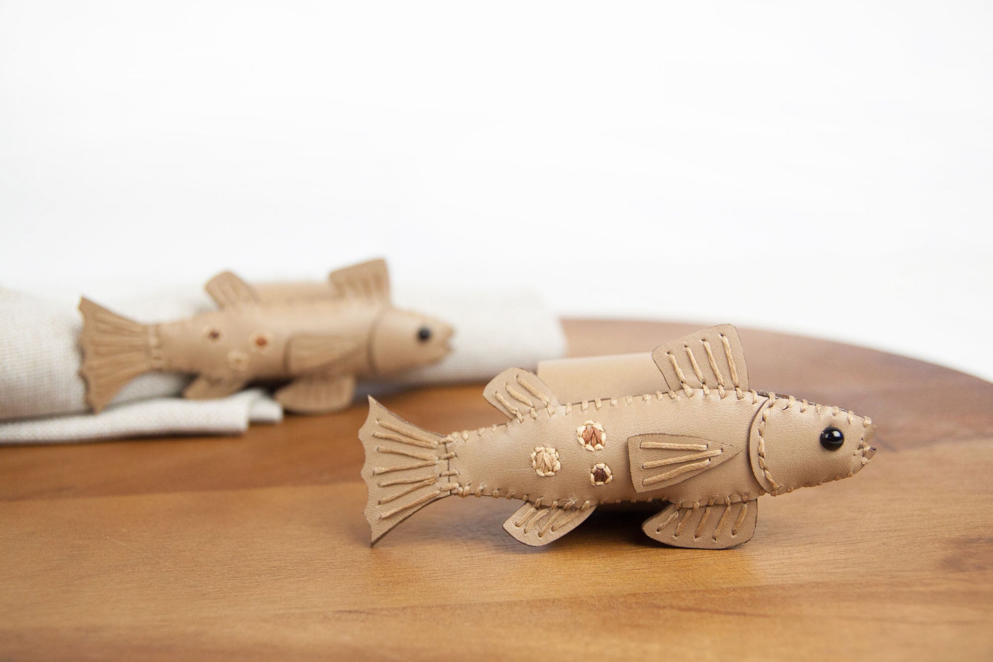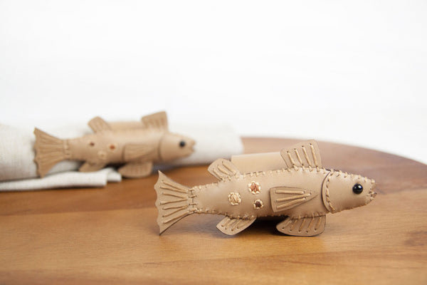 Length of Fish: 13cm - Ring Diameter Large: 5cm, Small: 3.5cm. Genuine Leather, Polyester Fibre Stuffing, Wax Thread, Safety Eyes, Snap Buttons.