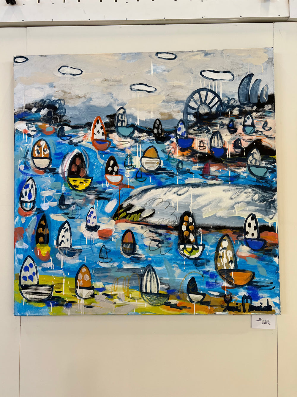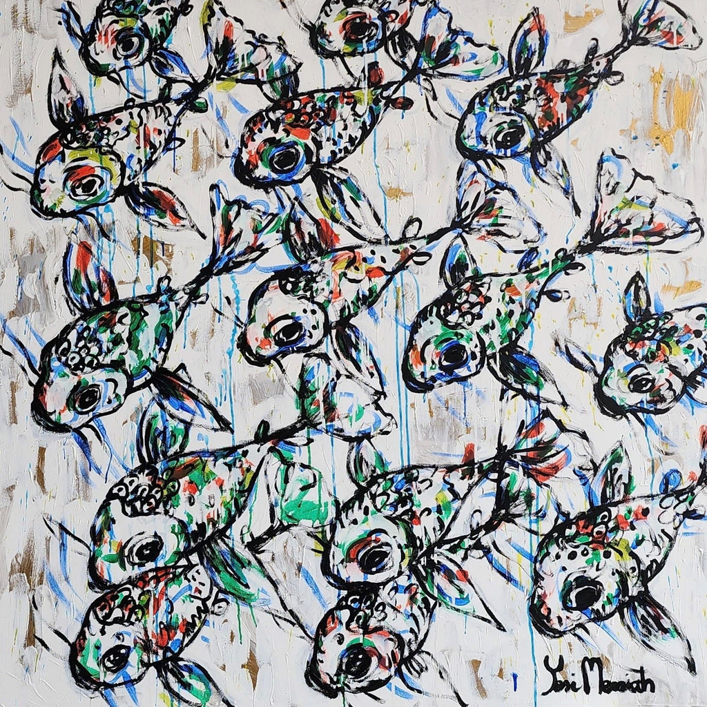 His work is characterised by a love of mark-making, a bold and exuberant colour palette, a vibrant collection of characters and a maelstrom of emotions. Fast and free, his bold colour combinations are an exciting visual experience. His technique of laying down colour and intricate brush strokes in sections, gives a unique sense of depth and movement to his work, bringing the paintings to life.