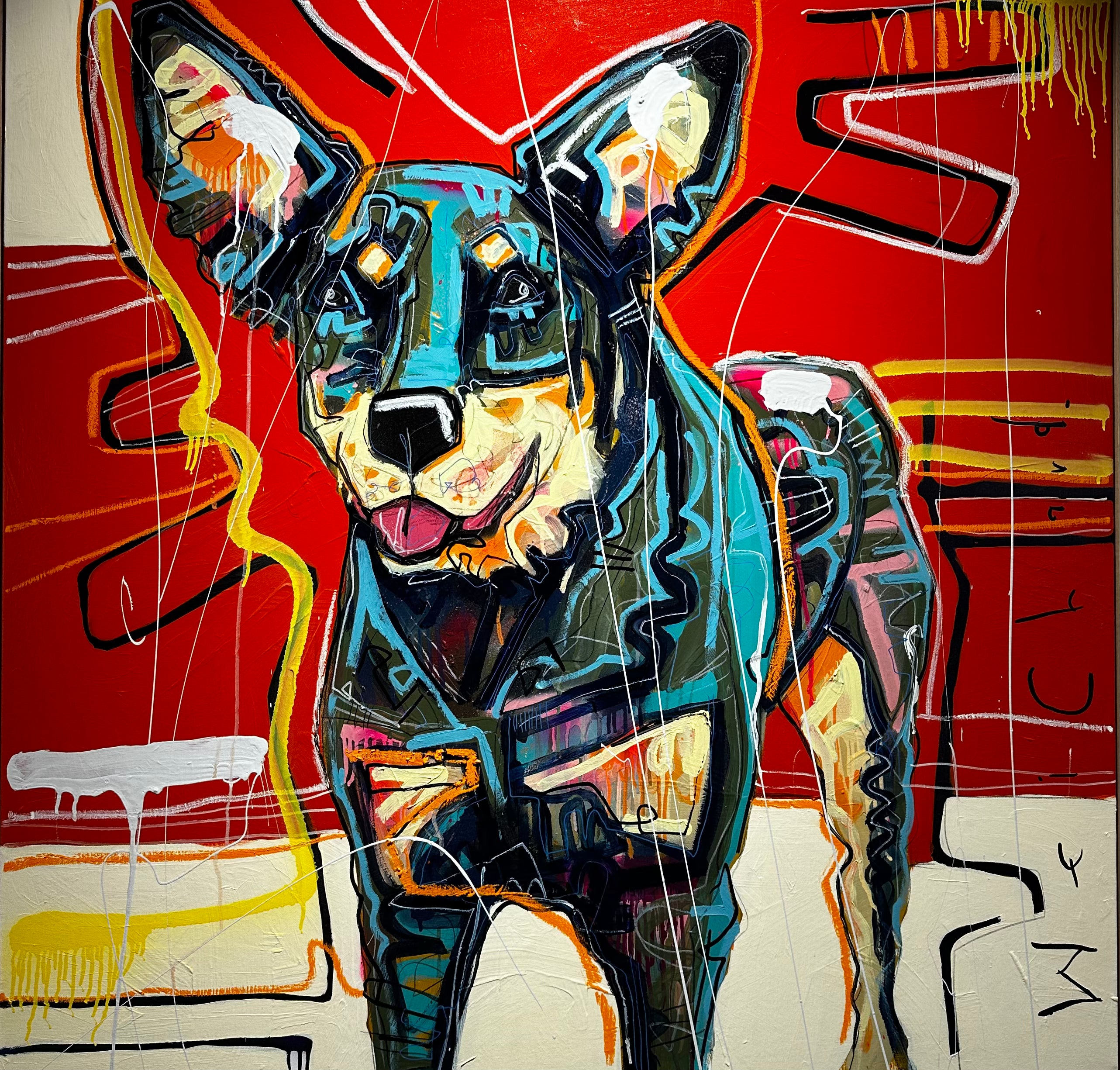 125 x 125cm. Oil stick and spray paint on canvas, framed in Oak.