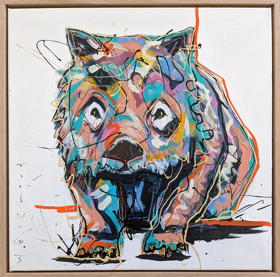 43 x 43cm. Acrylic, spray paint and enamel on canvas, framed in Oak.
