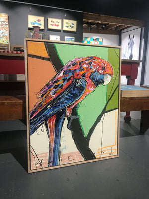 64 x 80cm. Acrylic, Spray Paint, Enamel, Charcoal & Oil Stick on canvas, framed in Oak.