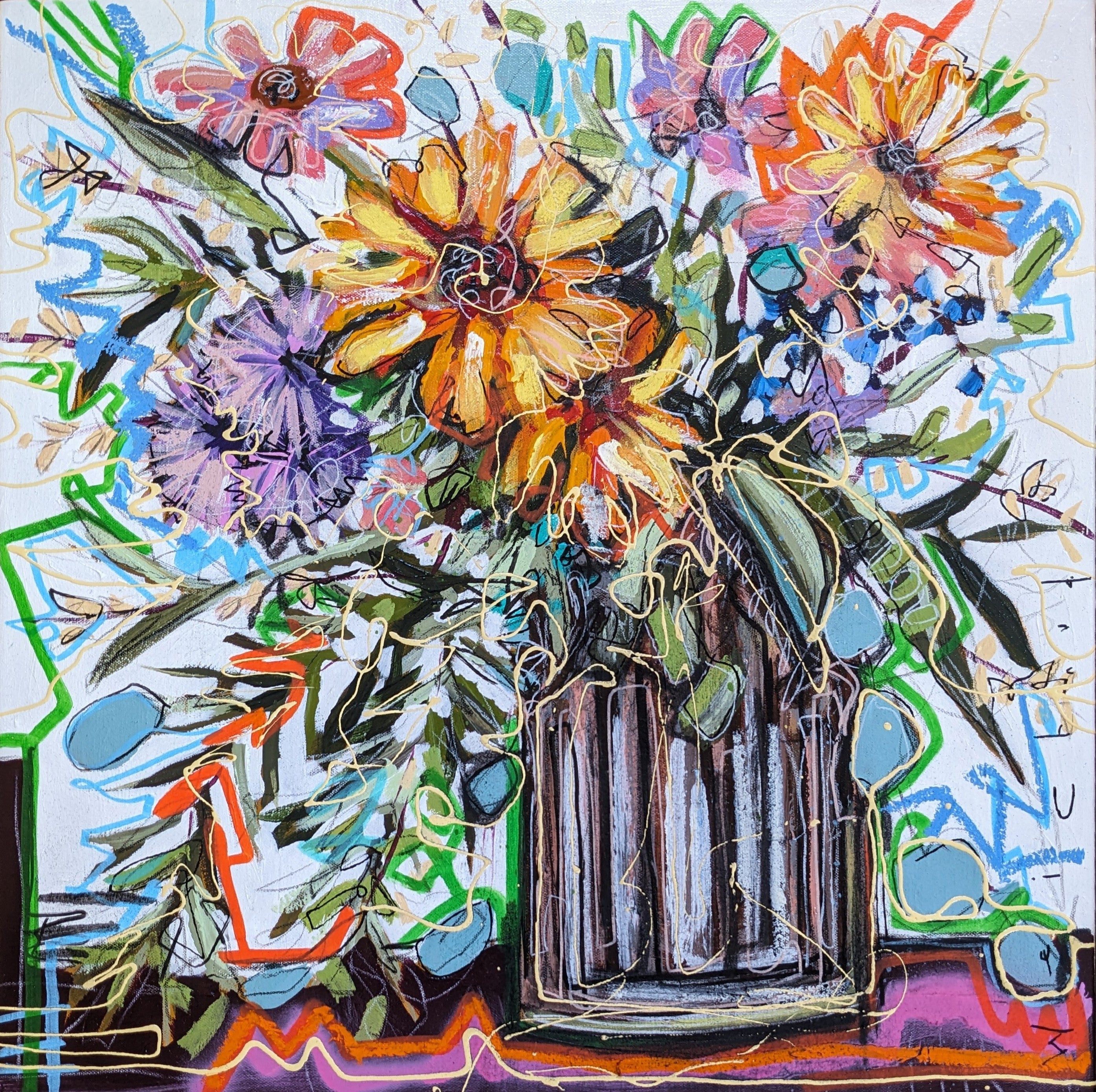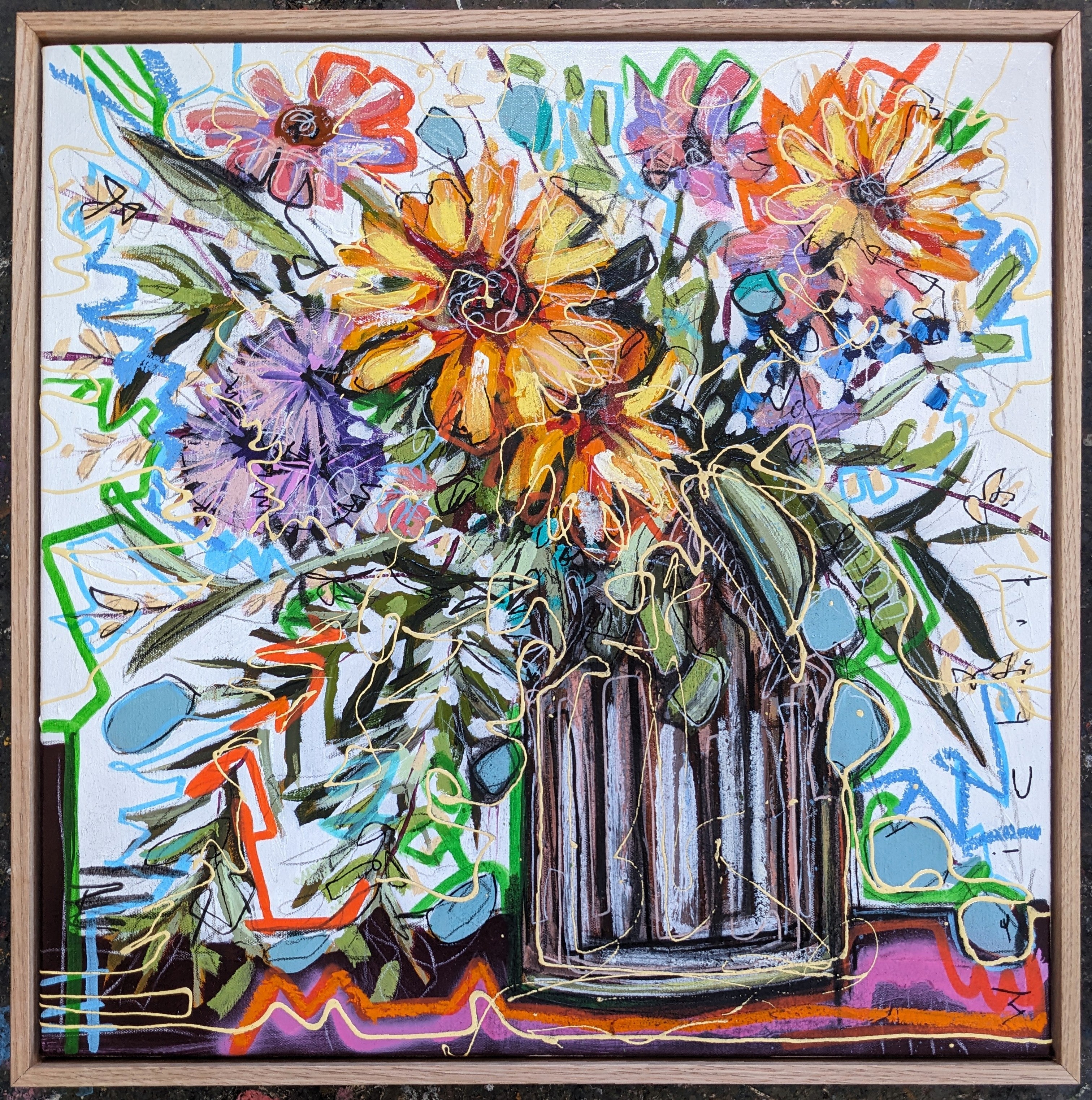 54 x 54cm. Mixed media on canvas, framed in oak.
