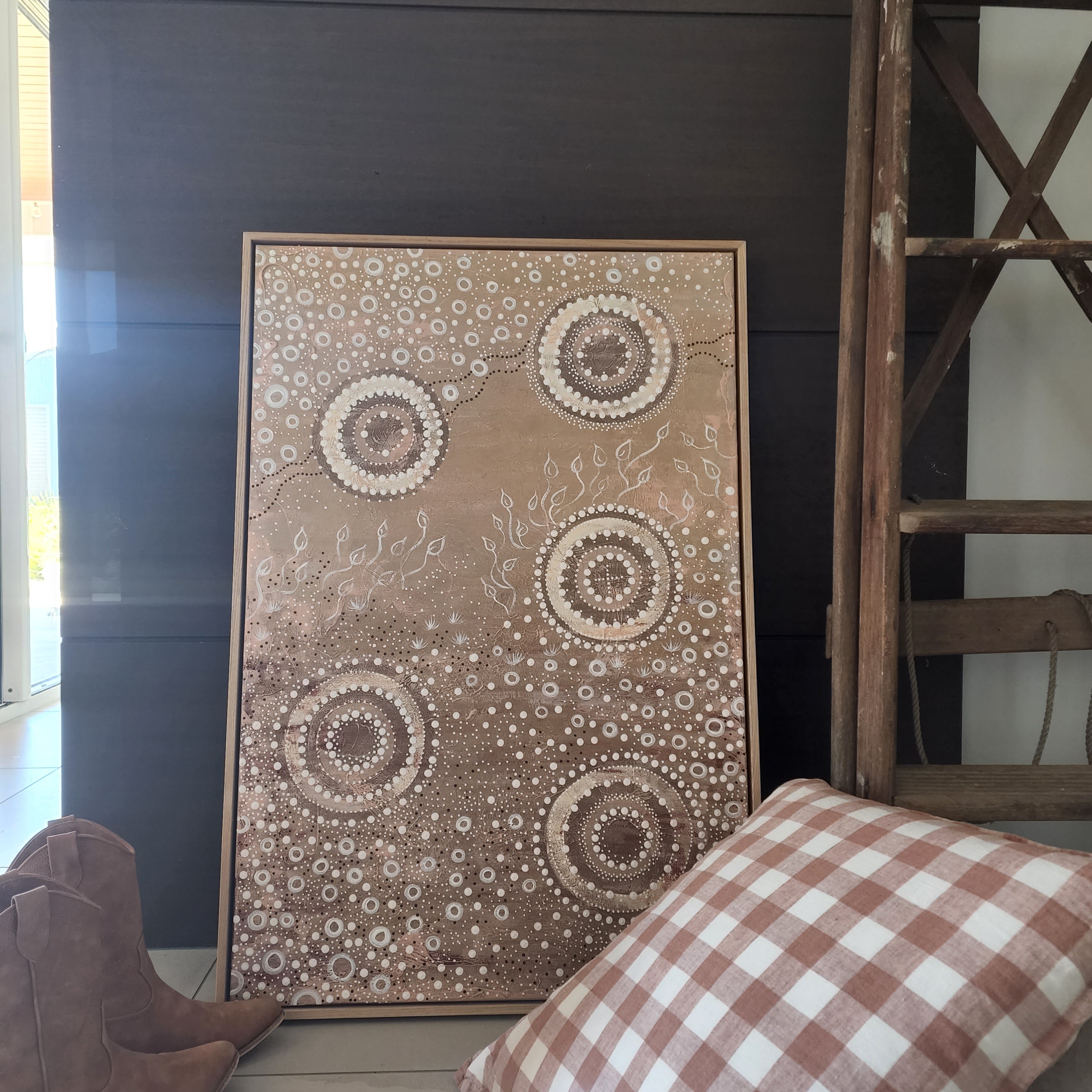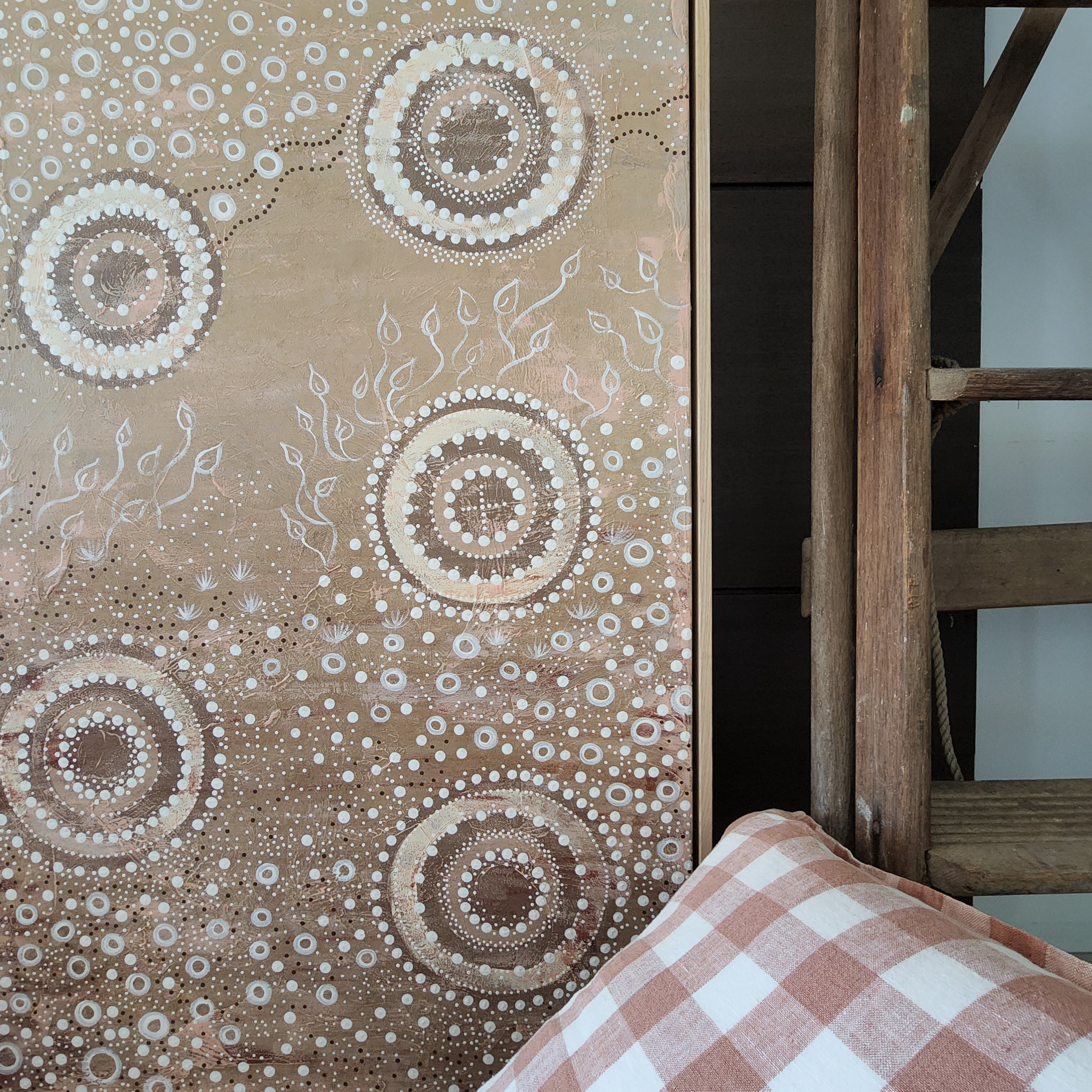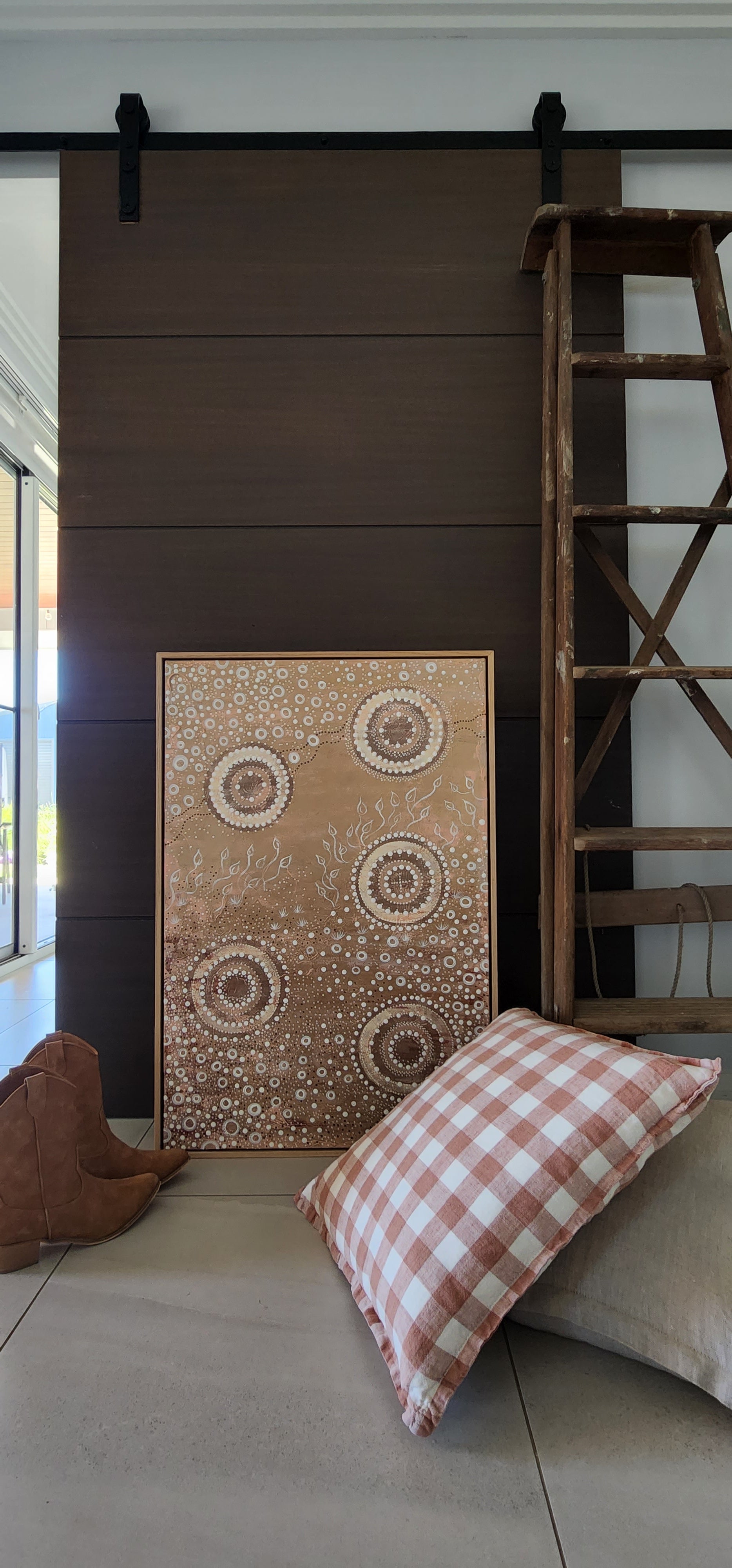 Artwork Meaning: This piece represents the dry lands of home through summer. It encapsulates the feeling of the hot months at home and the heat that consumes you. It is the scarcity of water, the desperation of the native grasses and the last of the wildflowers we see as the weather warms. It is the water holes, that replenished through the winter, and then dried, nothing more than cracks in the earth and a hint of what was. It is the hope of change and plenty. A metaphor for better days.