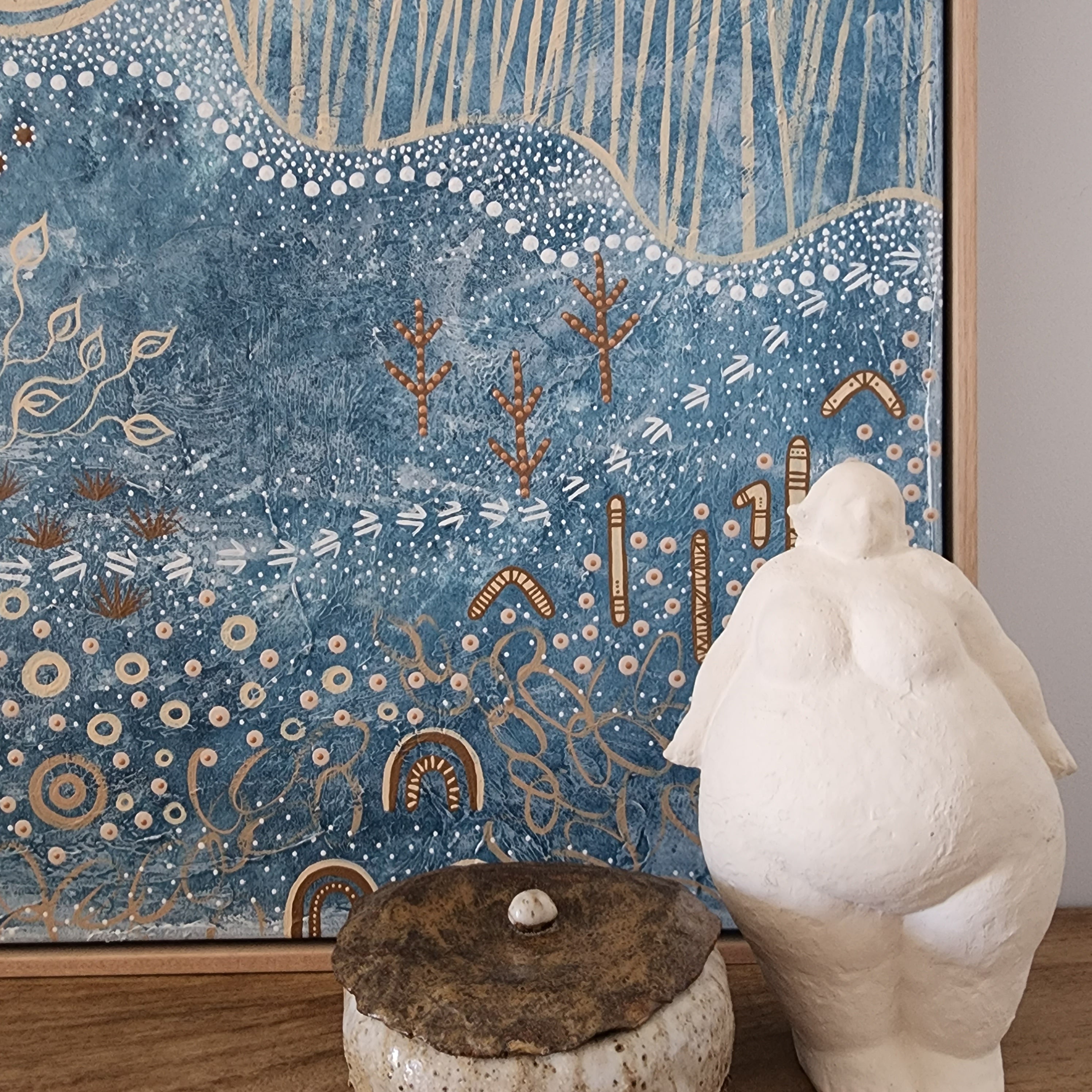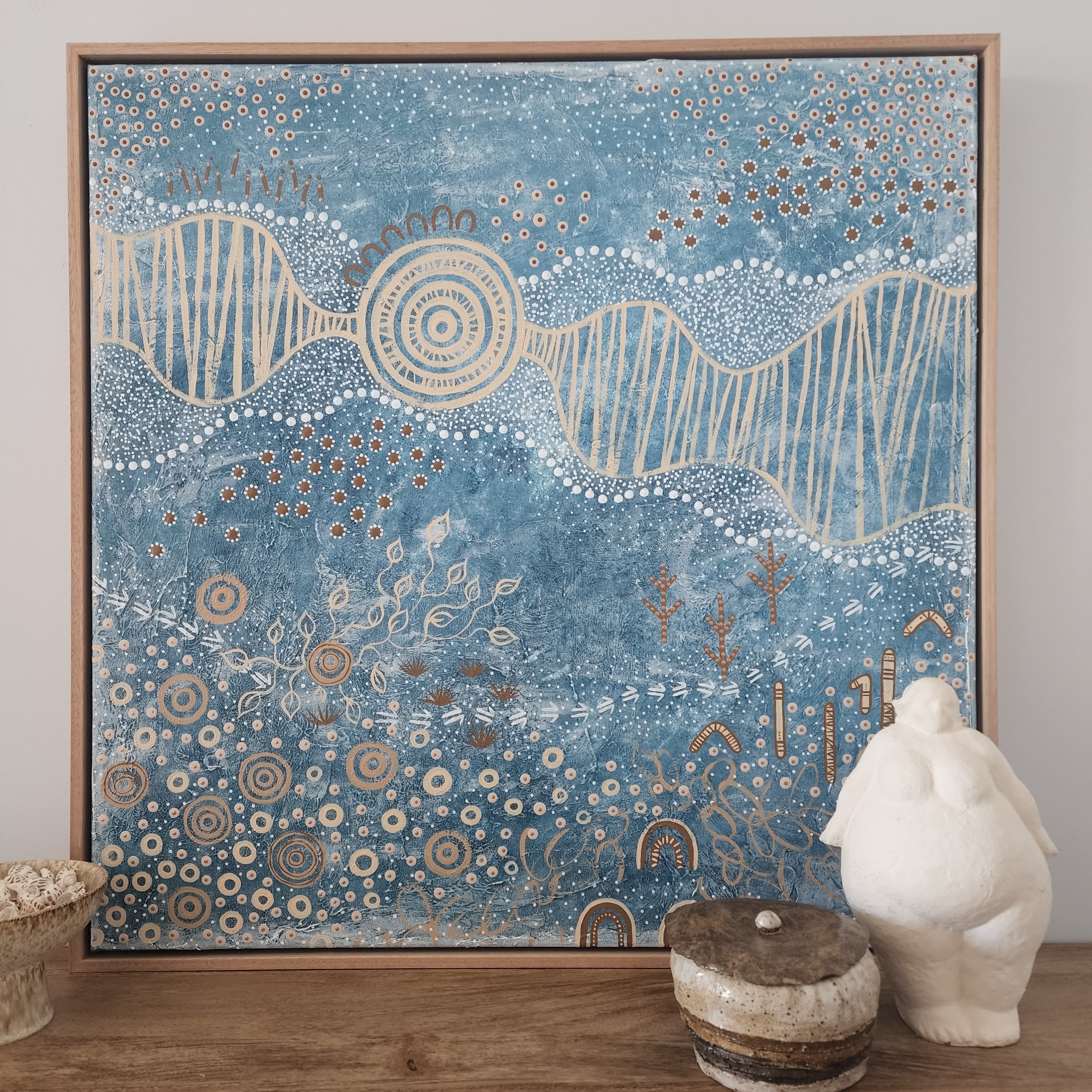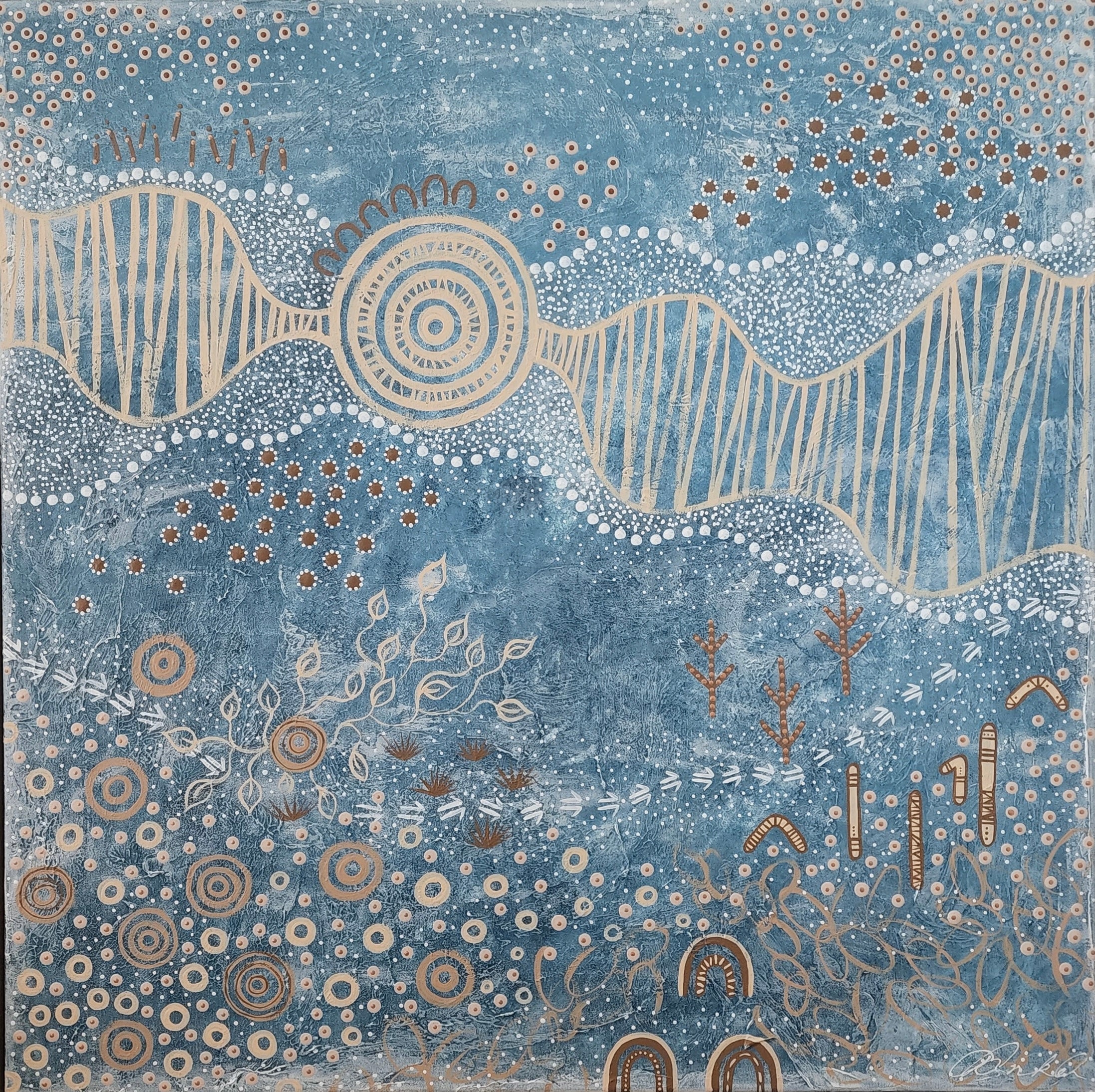 Artwork Meaning: This artwork is a representation of my home and what it embodies for me. It shares the seasons on Wiradjuri Country and the rich life I live, connected to my homelands. There is a central meeting place with my family nestled around. The wildflowers that adorn the hills adjacent my home sprawl across the canvas like they do the lands. Three prominent hills stand at the bottom of the work- all visible from my house, connecting me to the Dreaming stories of my ancestors, myself and my children. There is water- the giver and keeper of life, there are animals, connected to the land and thriving on it. There are trees, standing tall and proud. There are tools- a symbol of the tools Mother Earth gives us. All a symbol of my home and all a part of me, continuing to connect and remind me of my place on this Earth.