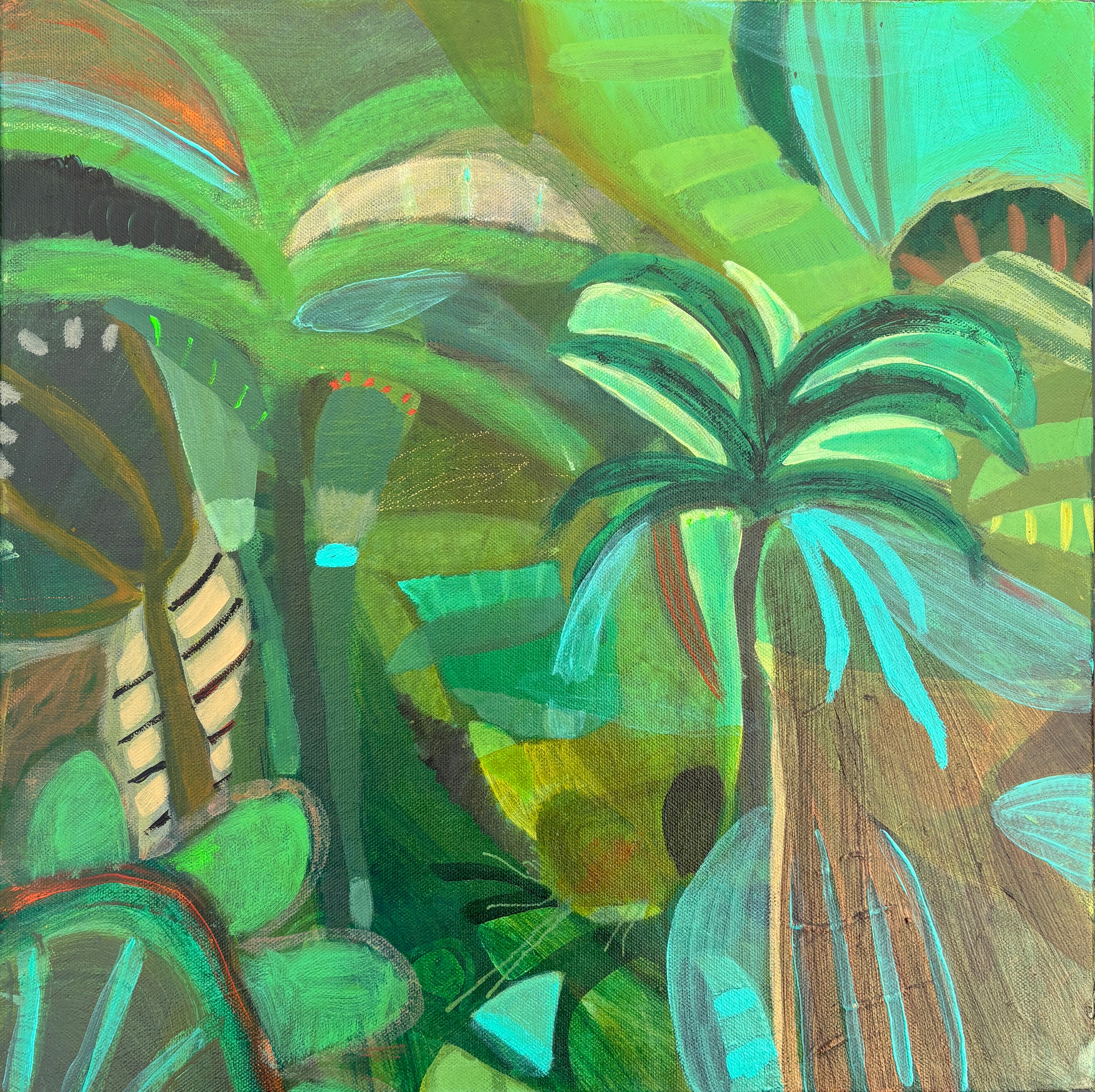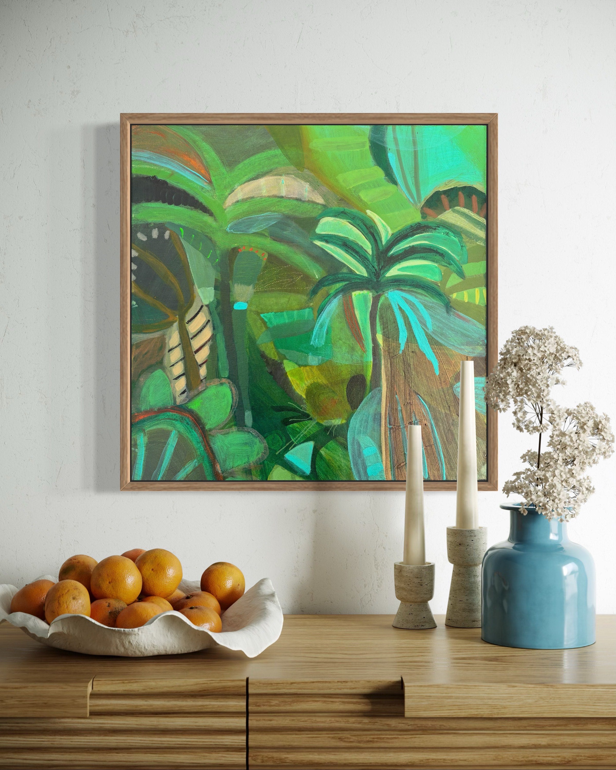 'Paradise to Me' centres on a commanding palm tree surrounded by layers of green, turquoise, and khaki, with warm pops of orange and peach that create a personal vision of a tropical sanctuary.