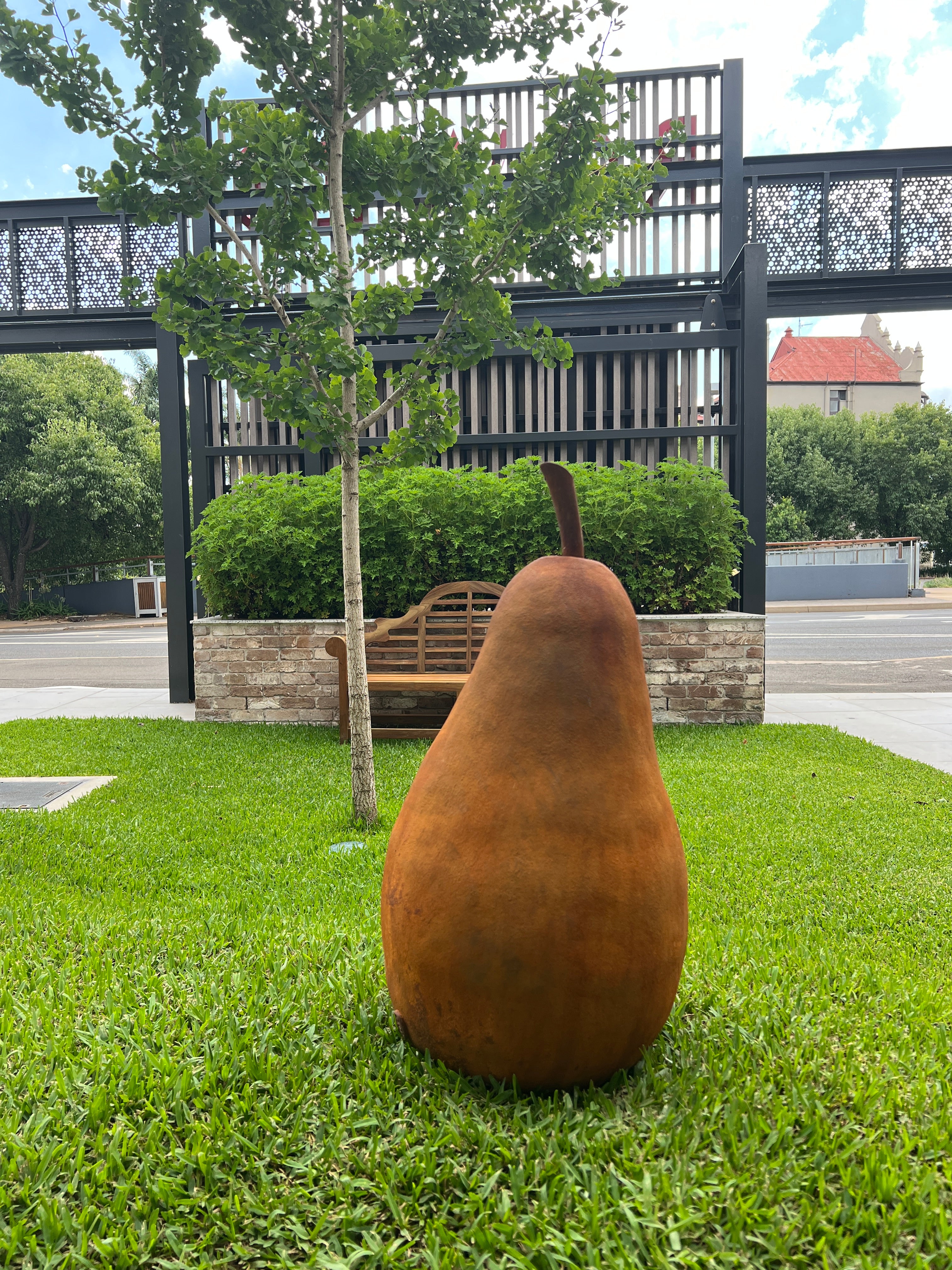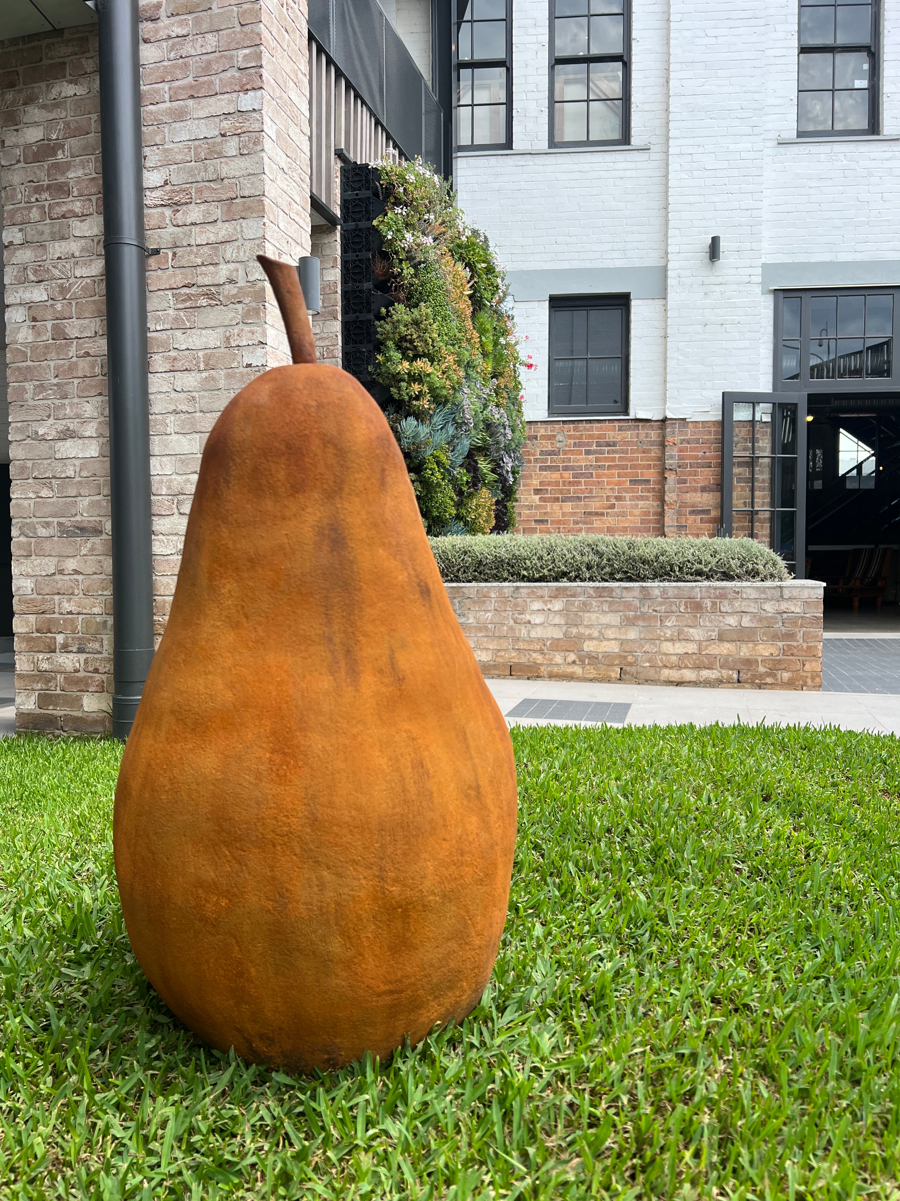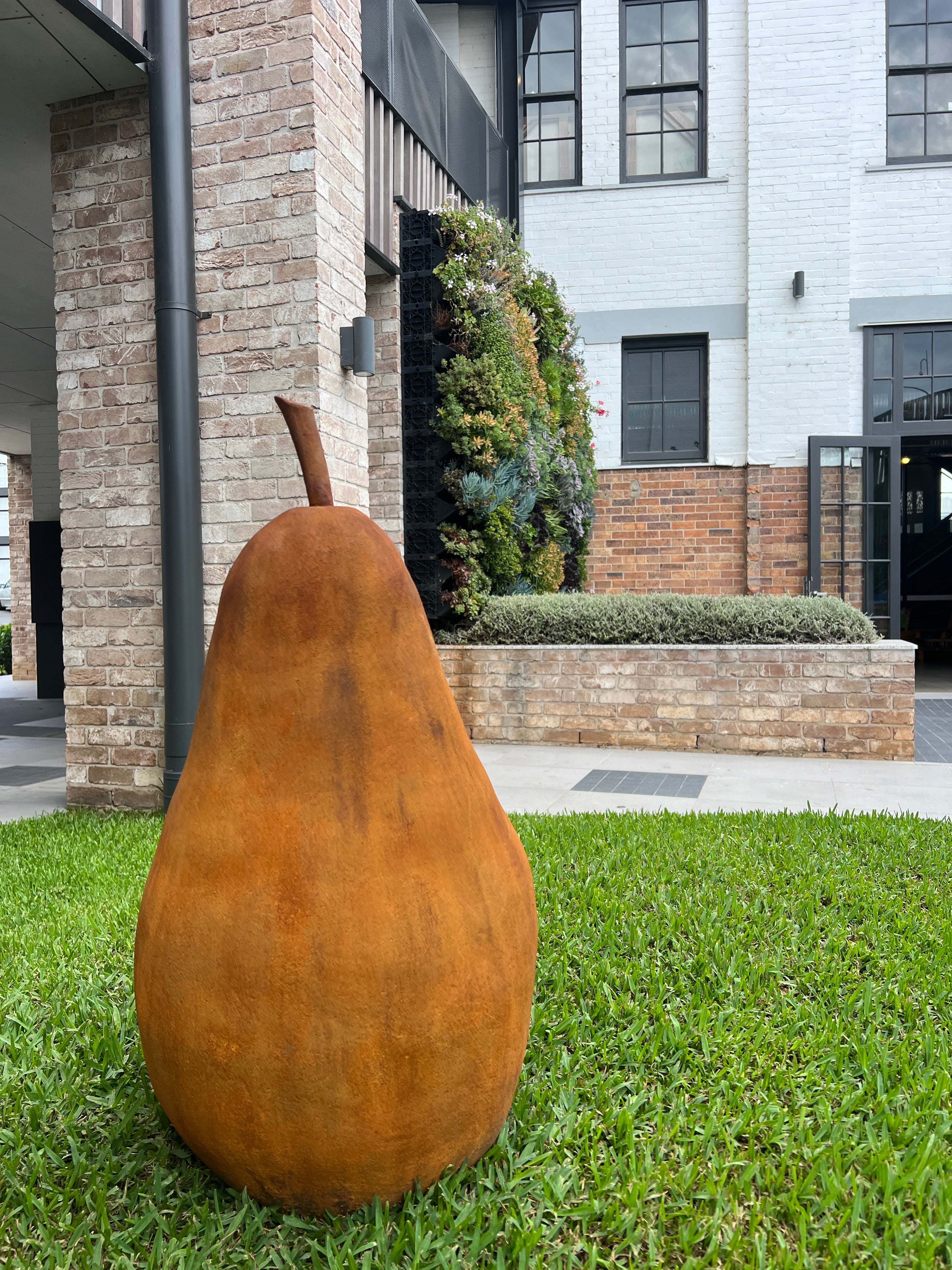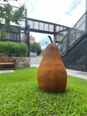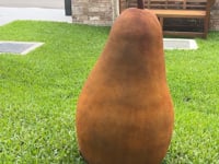 76 x 40cm. Fired hollow clay. Finished in 2pac with a rust look. Fully weatherproof. There is a hole in the bottom of the pear for you to place on a stake in the garden.