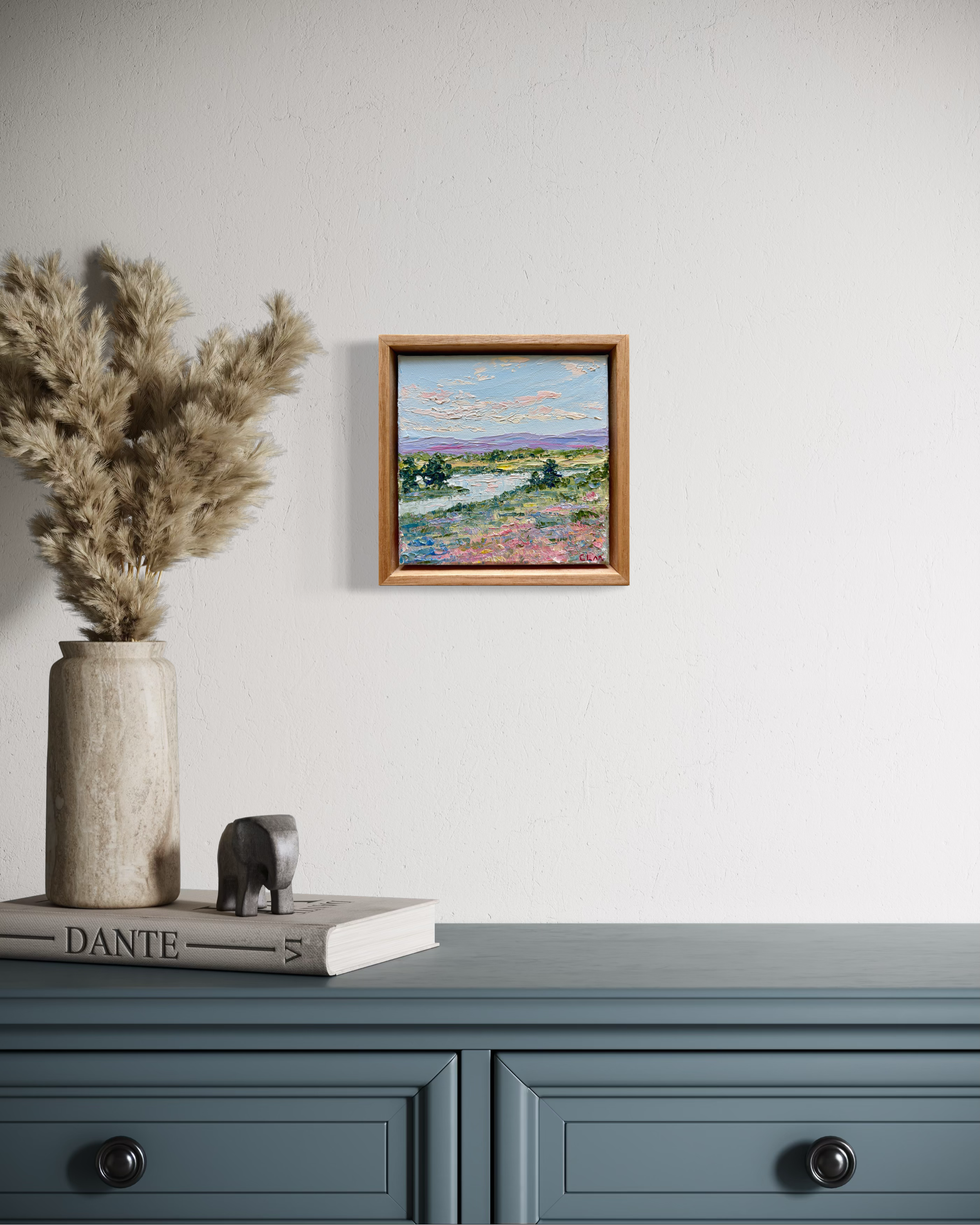 This impressionistic scene of a gentle river winding through the countryside is celebration of colour, while the use of a palette knife in creating the piece showcases the buttery texture of the oil paint. Perfect for eliciting peaceful feelings in the viewer.