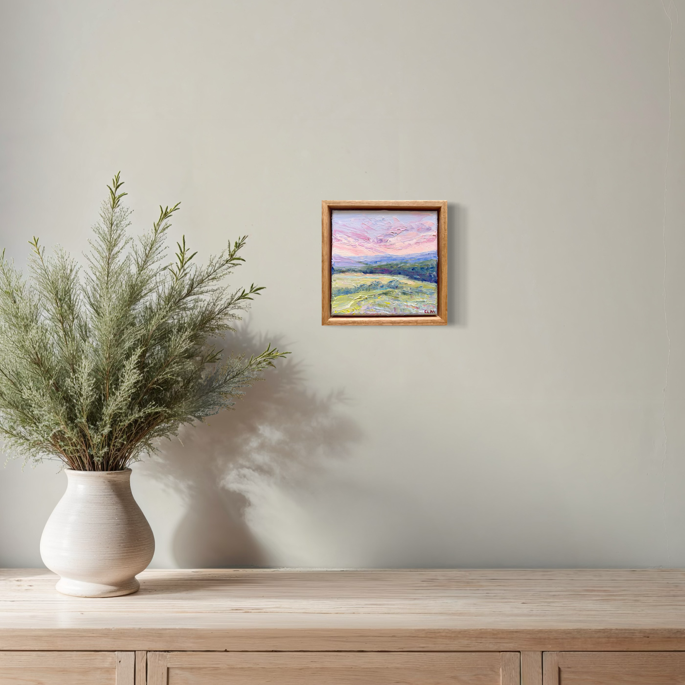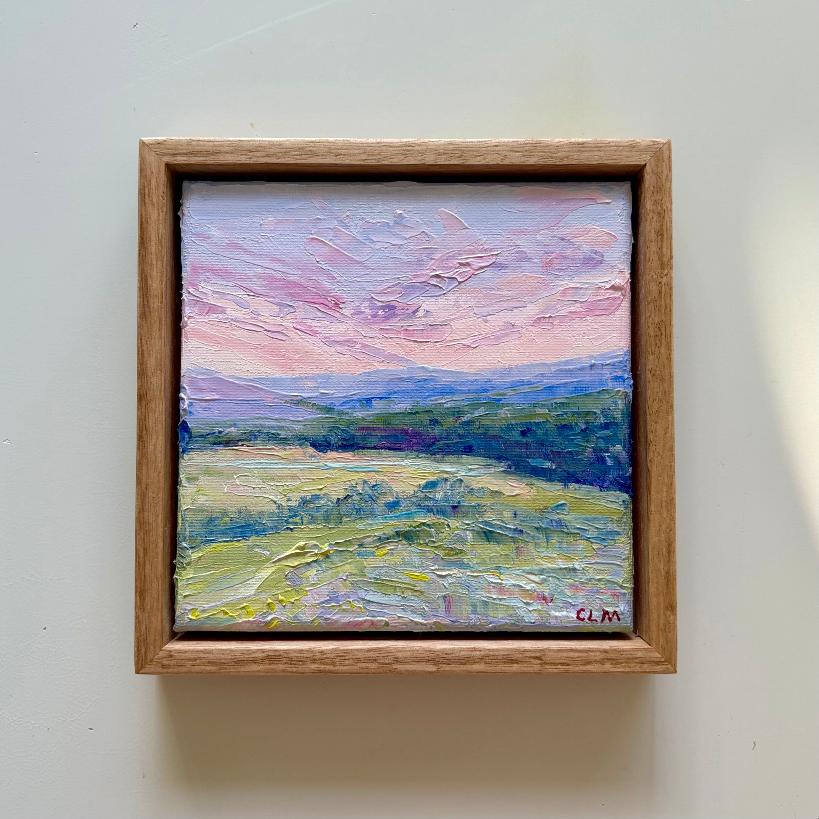 A tranquil landscape capturing the subtle tones of dusk. Painted with a palette knife and oils, this impressionist piece blends pink skies and lush fields, evoking serenity.