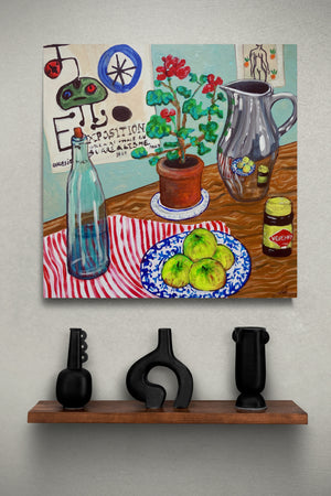 This piece continues the theme of Art within Art, and references to France and French/ European culture. A Juan Miro exhibition poster hangs on the wall as well as a Matisse postcard. I balanced this out by bringing in the all-important Australian Vegemite jar! The apples and red geranium are nods to classic Still Life painting, as they are elements the masters often use in their studies. The steel jug captures a distorted reflection of the scene. Textures and pattern play feature again in this work, as I find them so joyful. I like the idea of painting these little tablescapes, snapshots of ordinary objects that tell a story about everyday life. Our daily clutter says a lot about us!