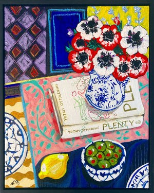 43 x 34cm. Acrylic and pastel on canvas, framed with black painted tasmanian oak.
