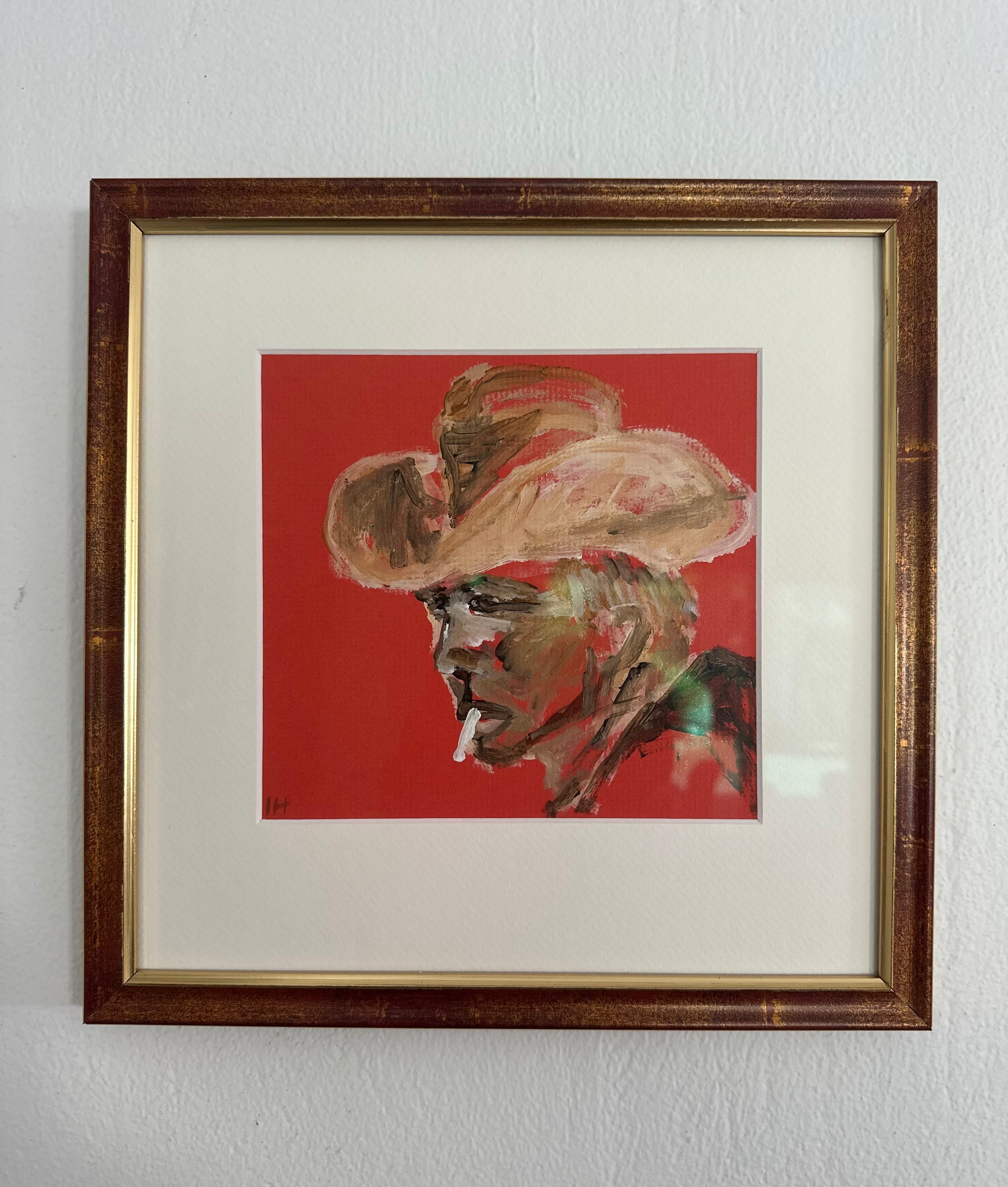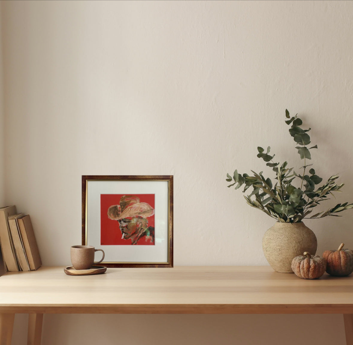 28 x 28cm. Acrylic on mat board, framed in gold/red frame behind Artglass