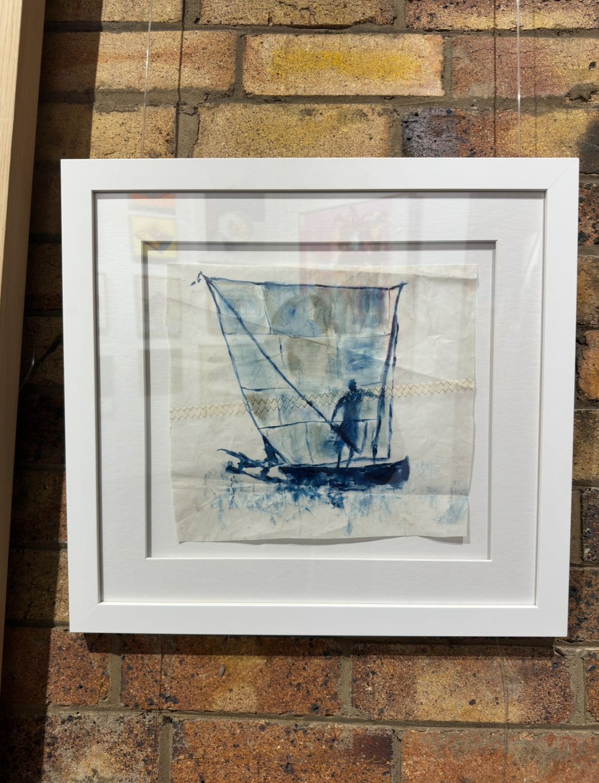 49 x 46cm. Acrylic on sail fabric, framed in white timber.