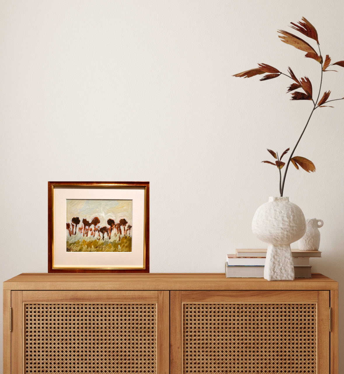 30 x 33cm. Acrylic on mat board, Framed in red/gold distressed frame behind Artglass