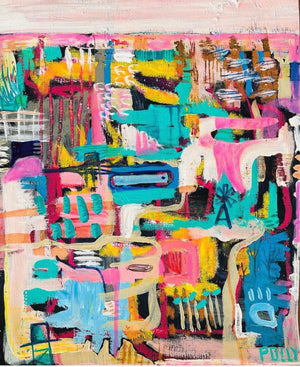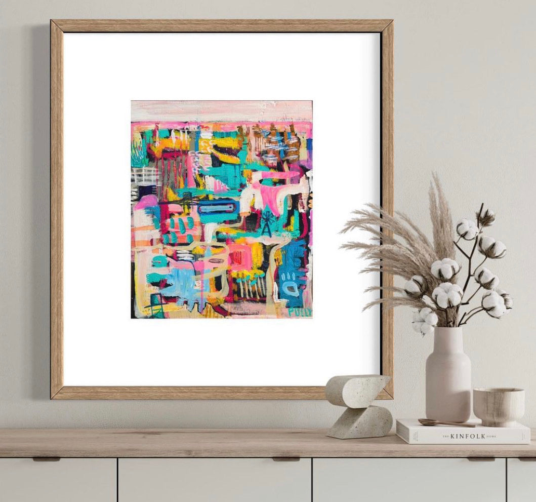53 x 59cm. Mixed medium, Acrylic, oil stick pencil. Framed under glass. 20mm oak frame