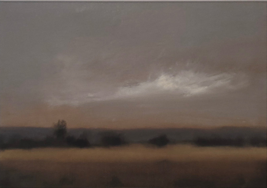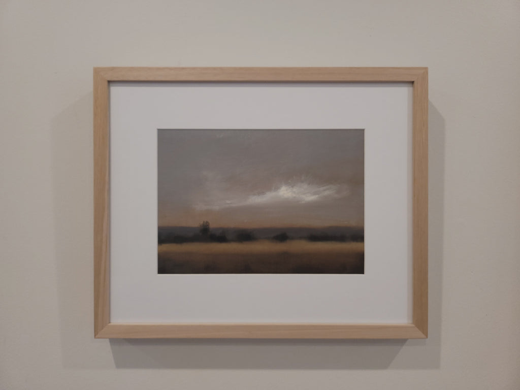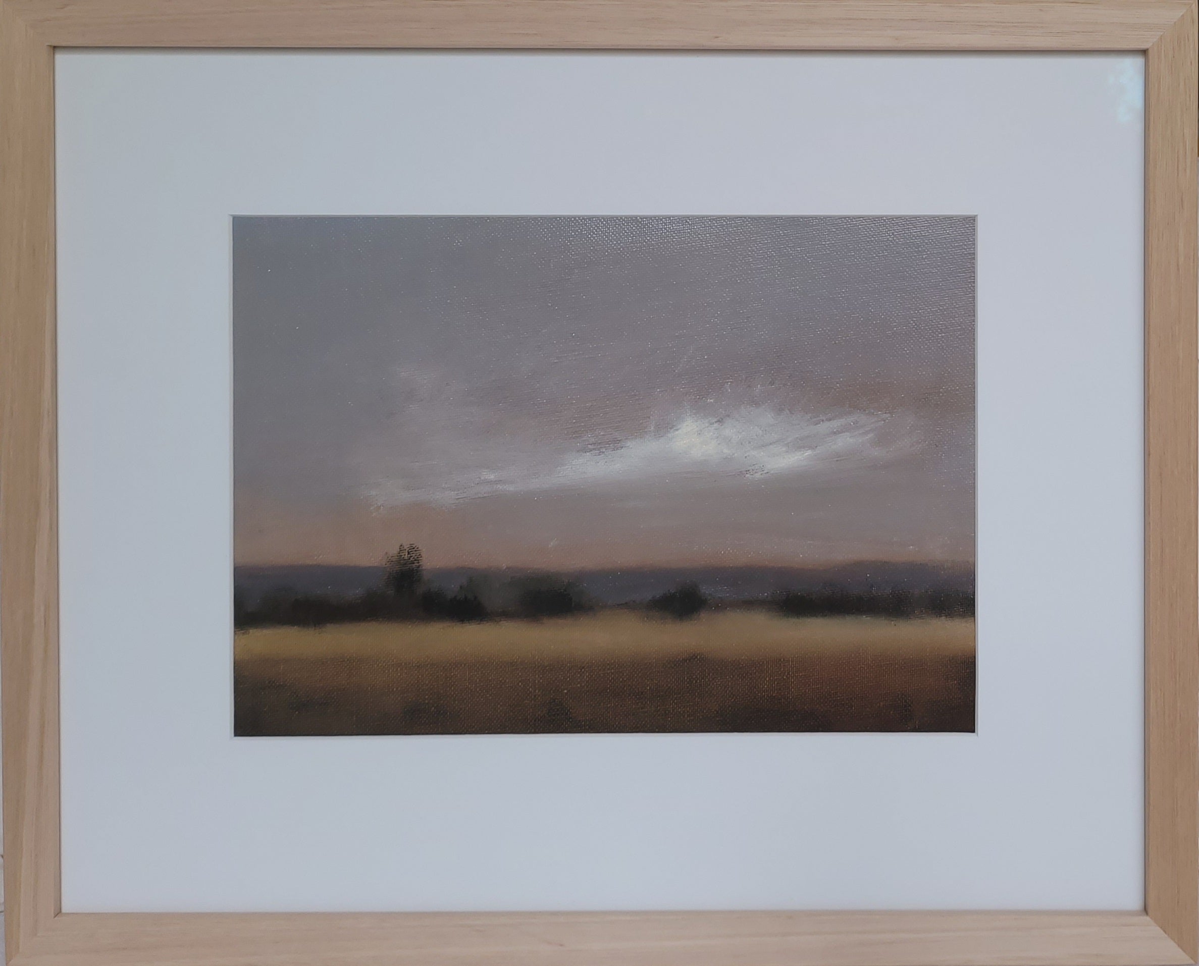 28 x 38cm. Oil on cotton duck canvas paper, framed in natural oak behind Artglass.