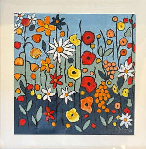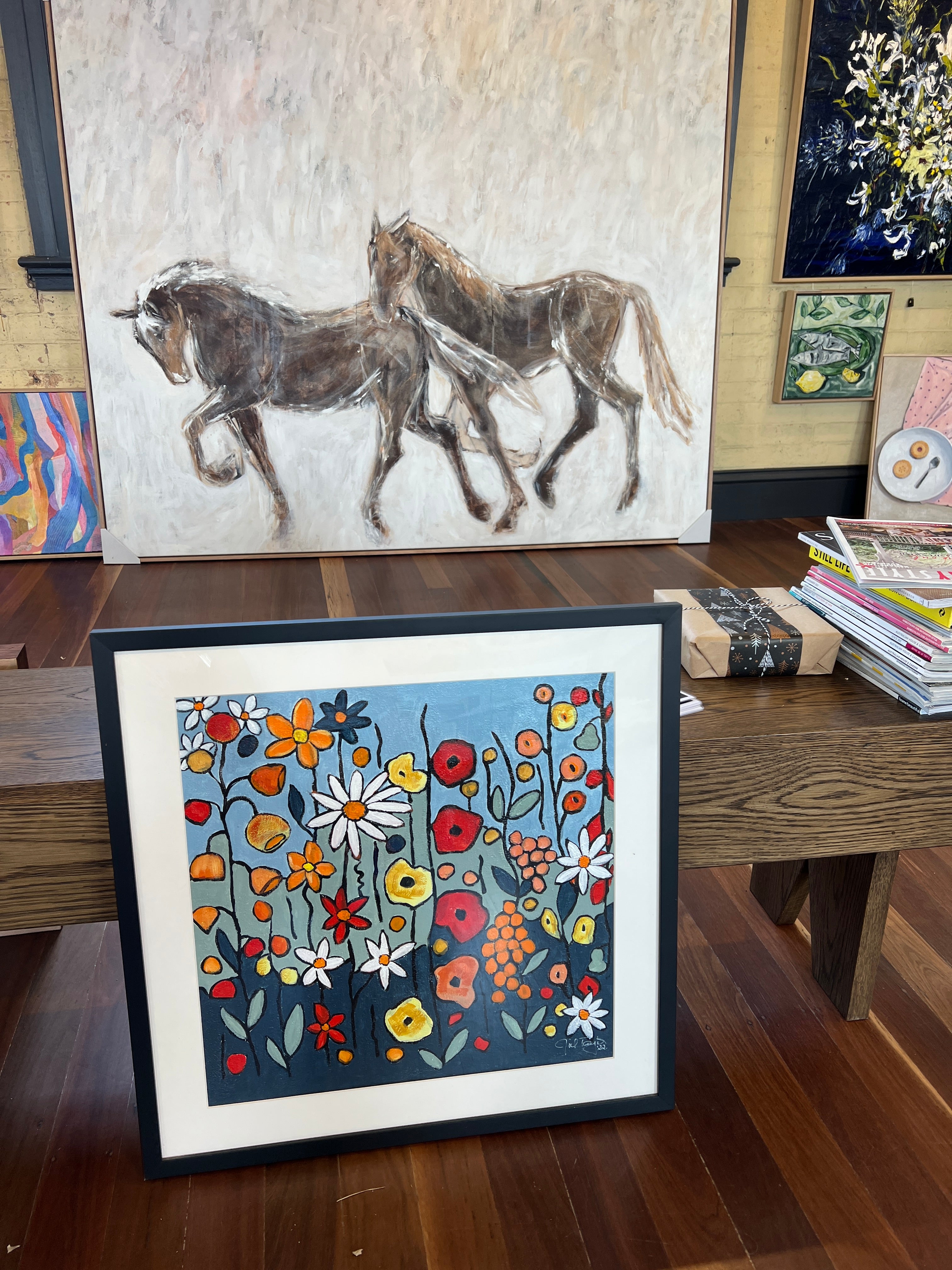 60 x 60cm. Acrylic on board, framed behind glass in a black frame.