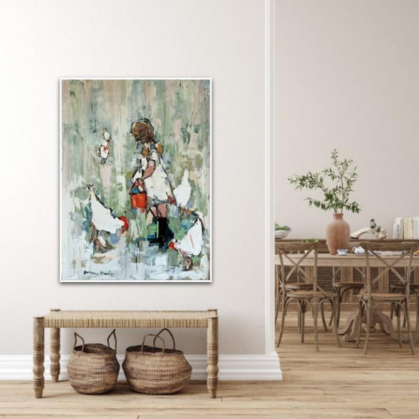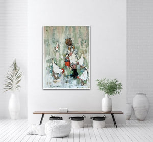 125 x 95 cm oil on canvas, framed in white timber box frame.