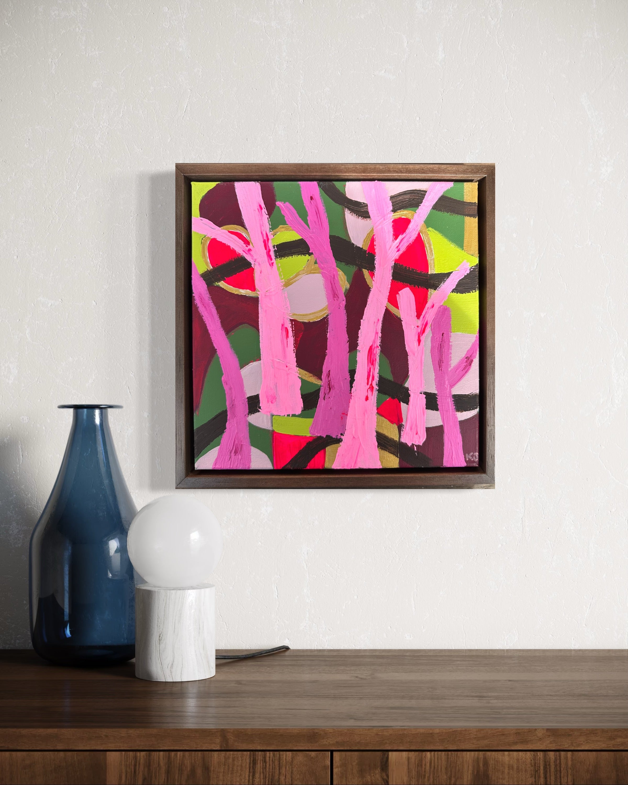 33 x 33cm. Acrylic on canvas, framed in charcoal brown timber.