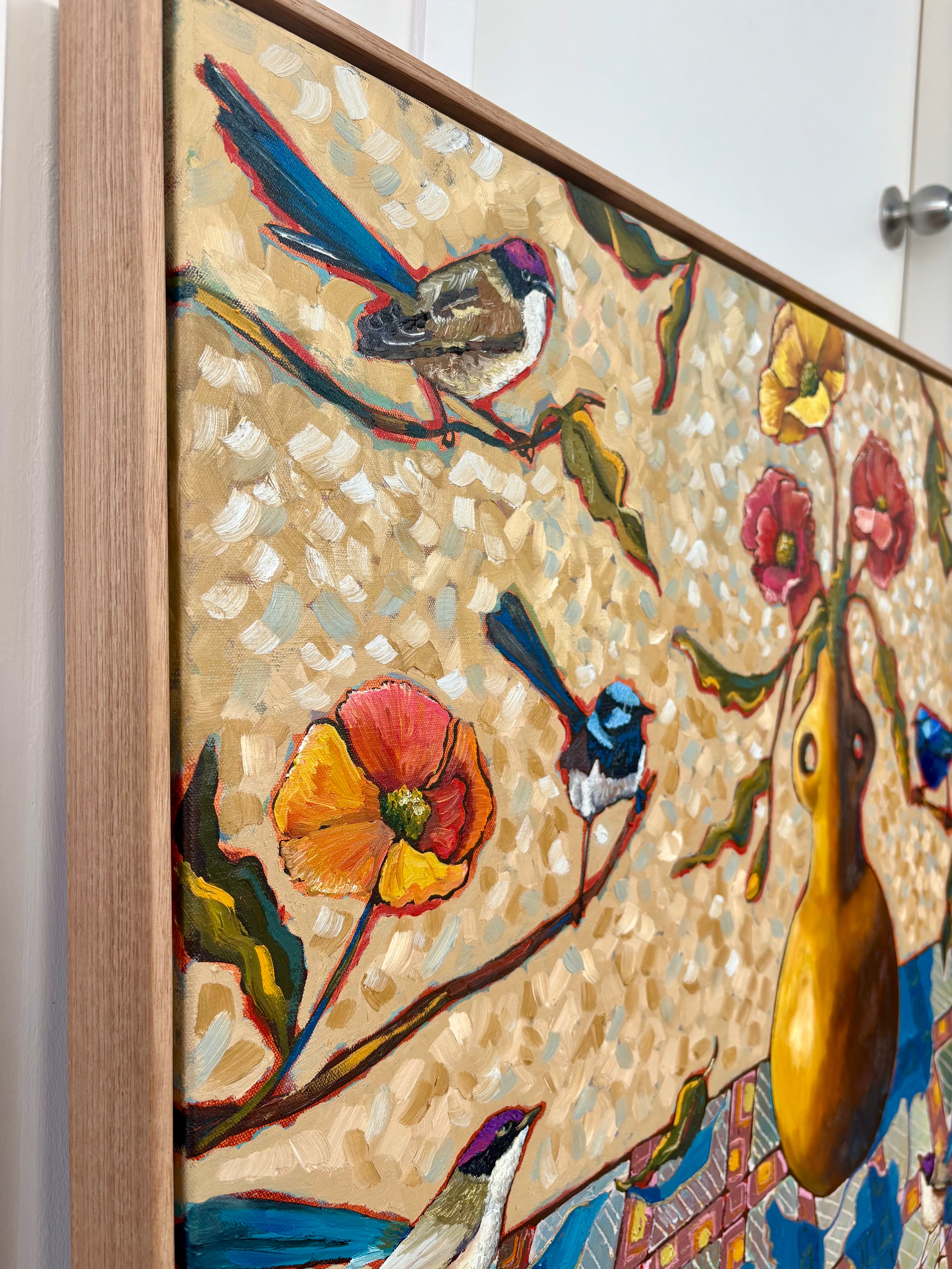 Blue wrens are delightful! Imagine my joy when I discovered that there are many different species of Fairy Wrens. I wanted to show off their exquisite colours by placing them into a golden yellow scene with bright poppies and blue shadows.