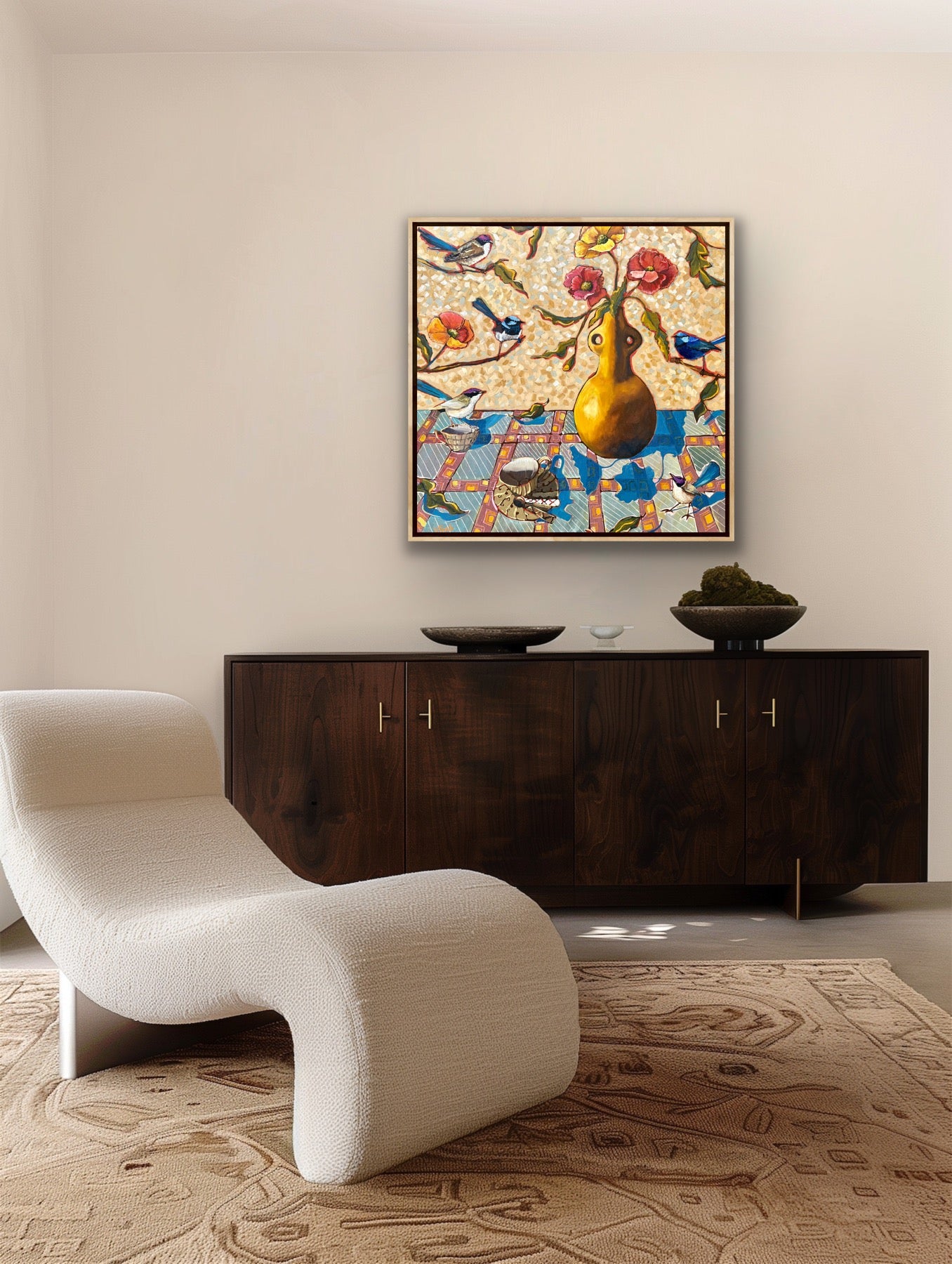 My infatuation with nature and interiors meet on the canvas in finely tuned compositions. The intention is to create places of beauty, wholeness, and boundless imagination. You will often find a jabiru or saddle-billed stork wading across a formal lounge, or a flamingo dosing off on a staircase. I work in oil paints to create a visual narrative that presents a settling of the external in the internal. A joyful cohabitation of the domestic and the natural world.