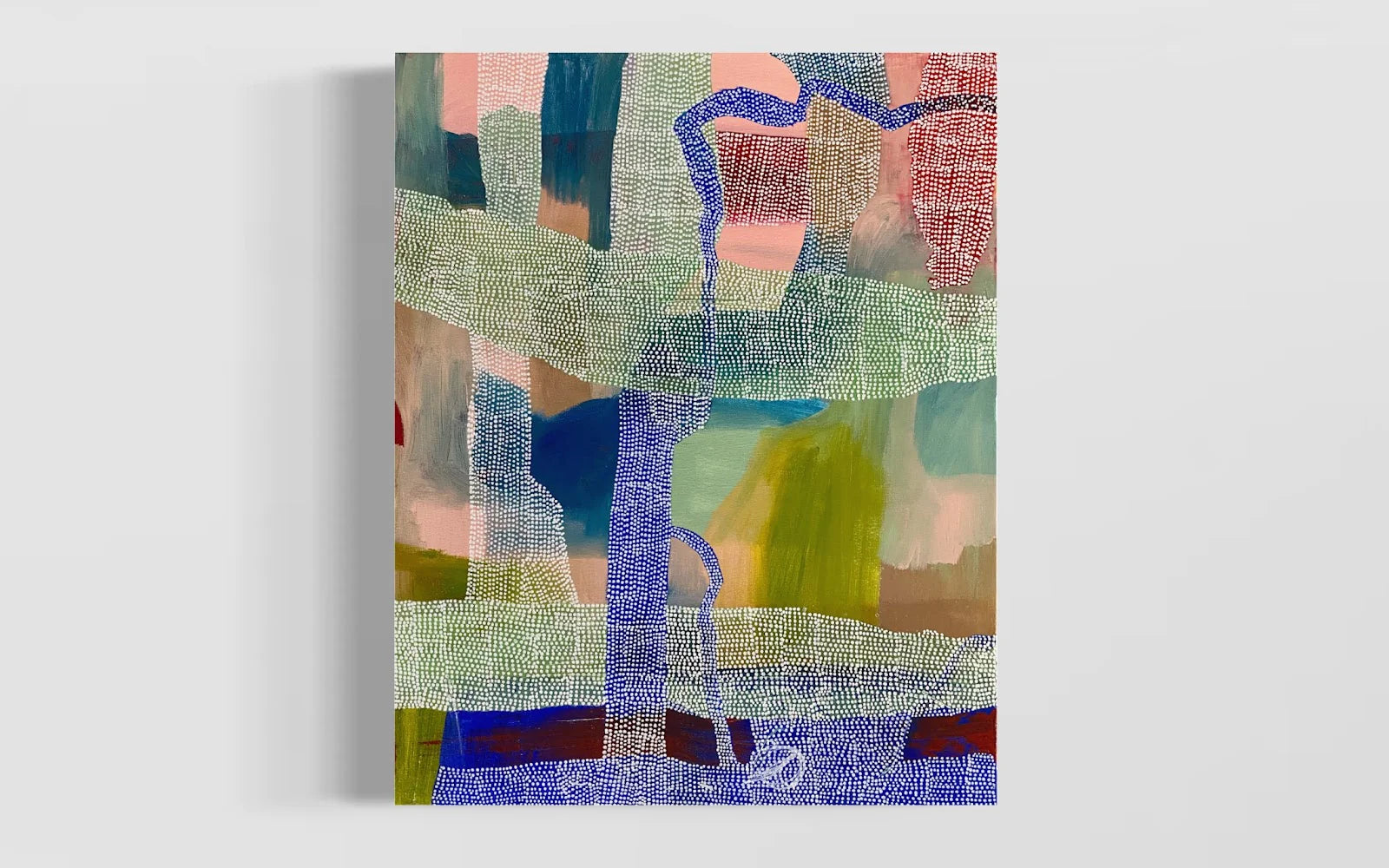 42 x 52cm. Mixed media on canvas, framed in Tasmanian Oak