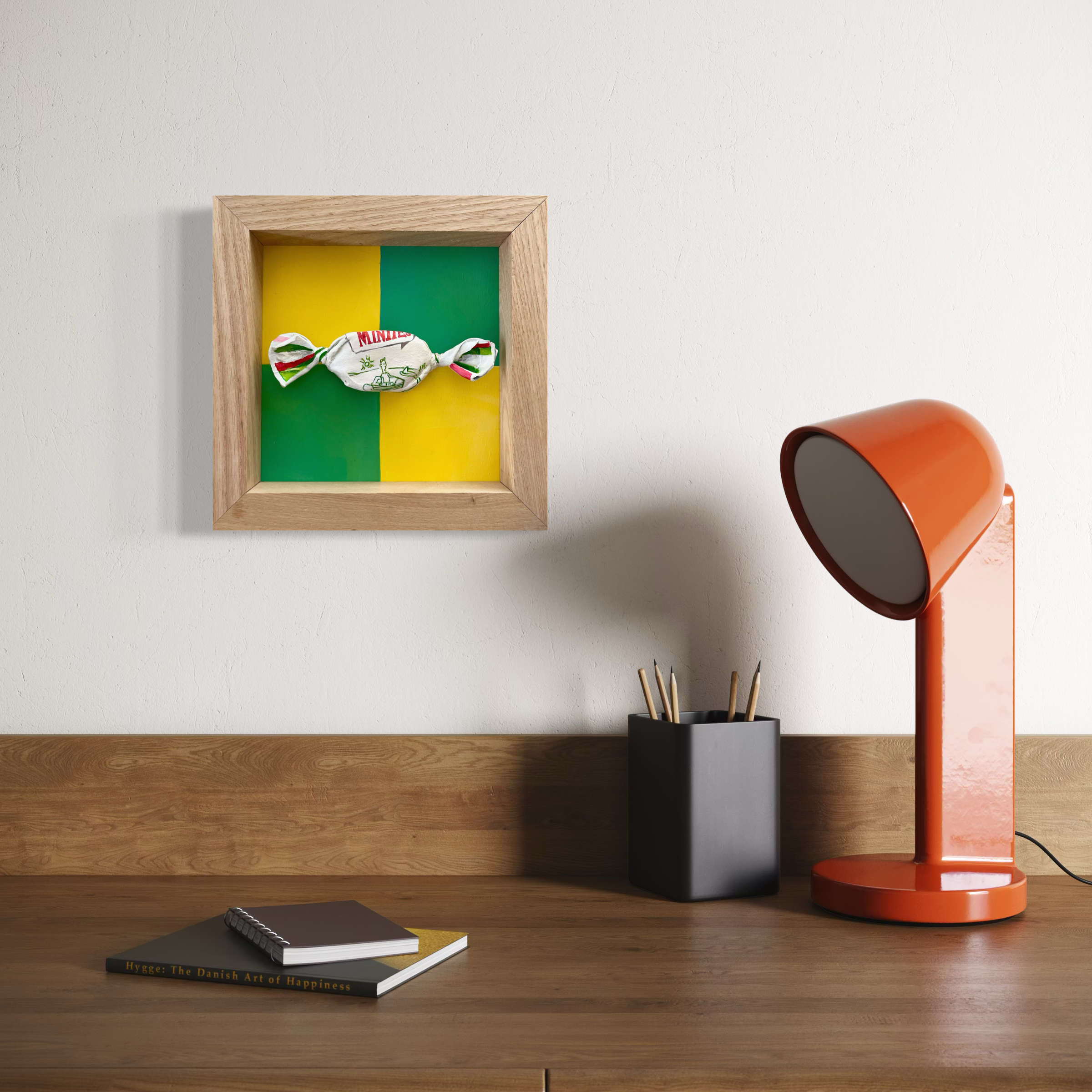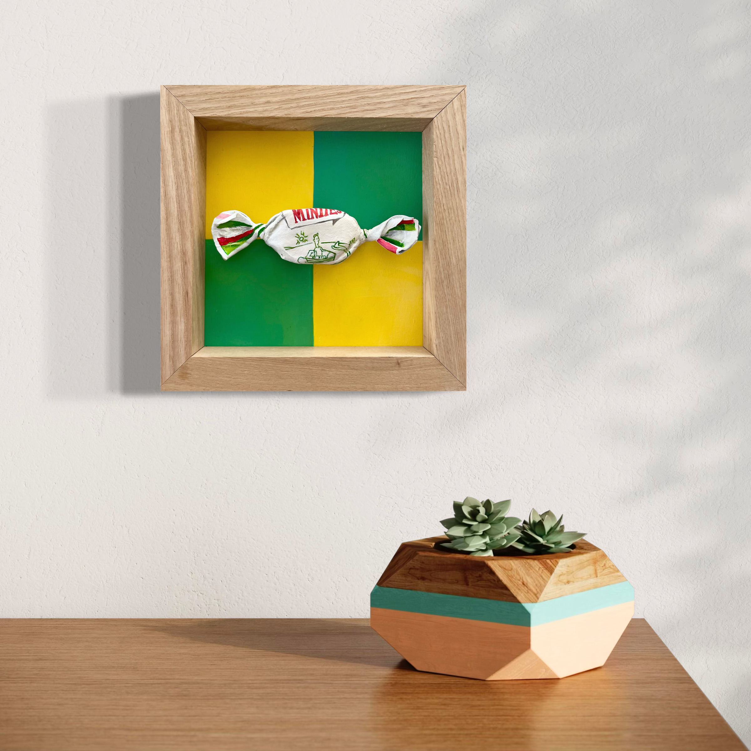 I have made my ever popular minty into a 3D masterpiece! This one featuring a presumably hungry circling shark. The minty itself is set deep into a box frame so it has wonderful character and depth- a beautiful pop of colour and intrigue.