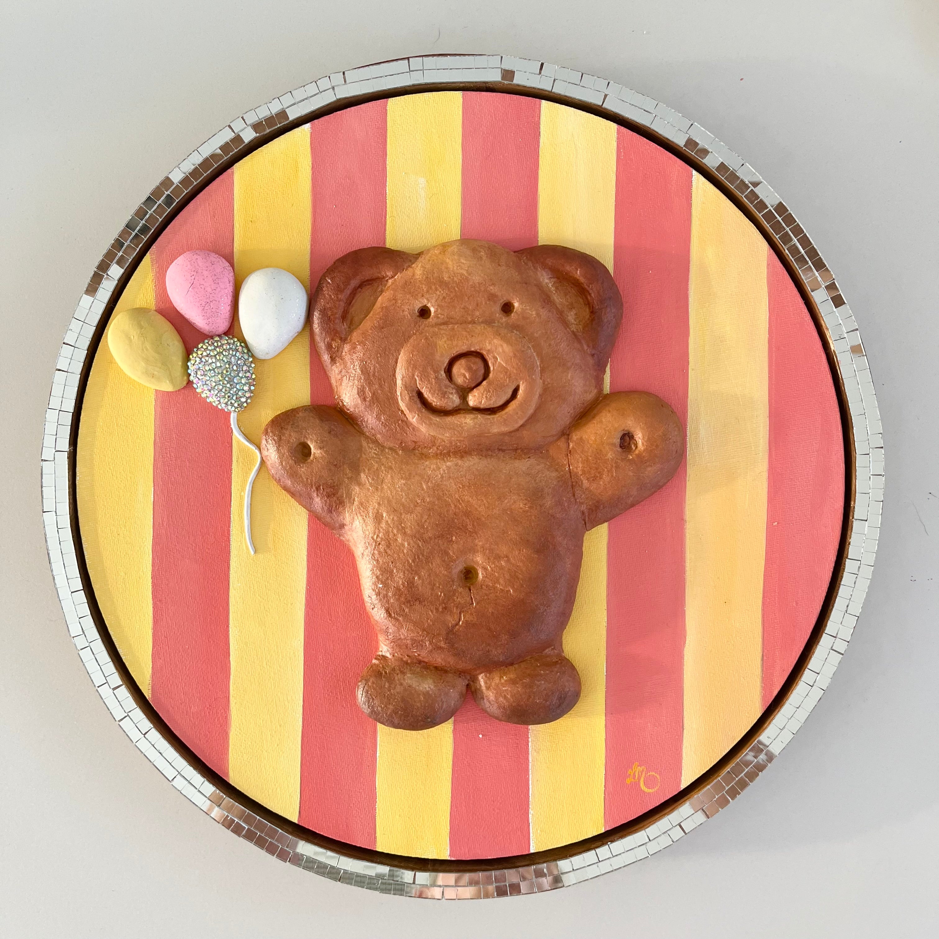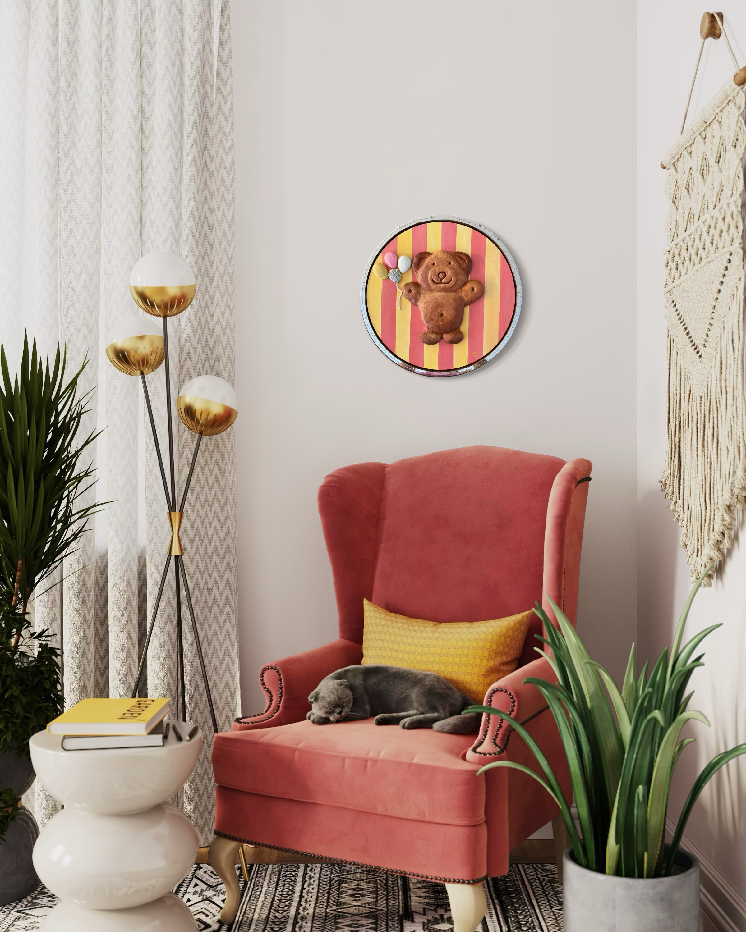 Leonie's 3D art collection is a series of mini artworks hand sculpted with polymer clay and each piece painted with oil paint to give it that realistic touch and added to the canvas so your art is literally looking good enough to reach out and eat! This happy guy comes complete with a blingy rhinestone balloon and a gorgeous mini mosaic round frame