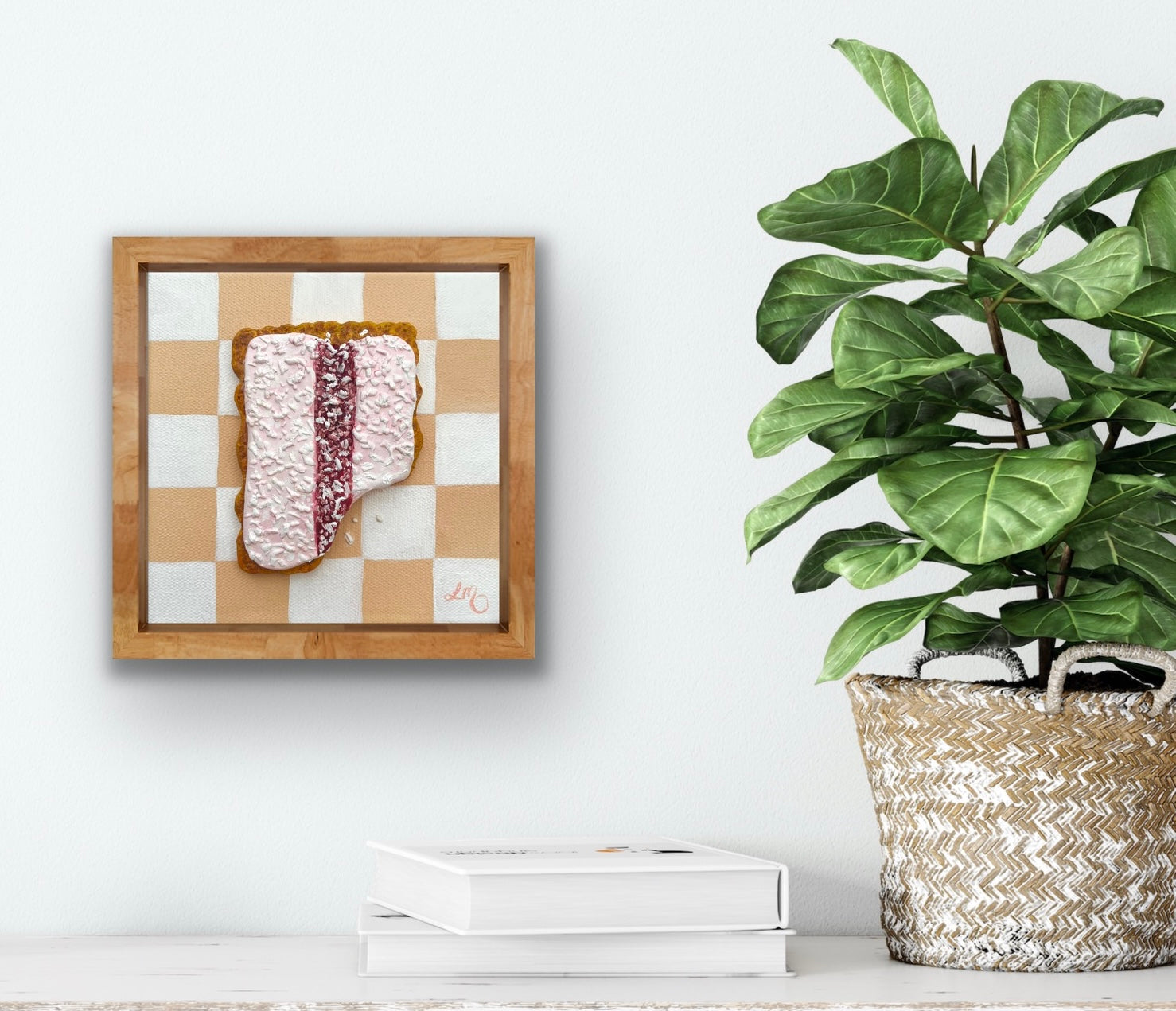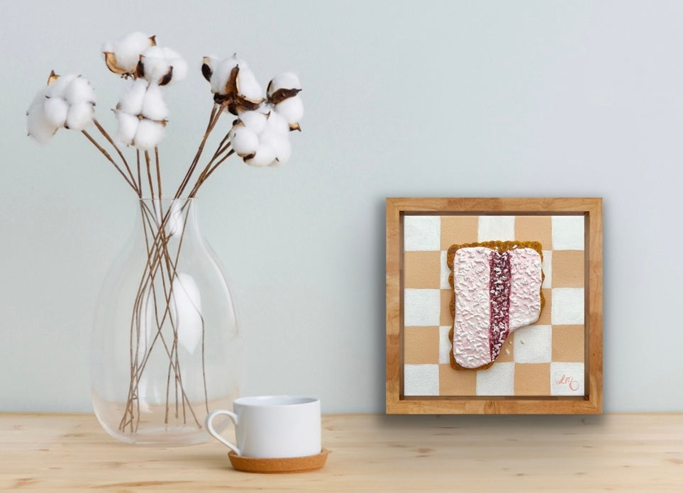 Leonie's 3D art collection is a series of mini artworks hand sculpted with polymer clay and each piece painted with oil paint to give it that realistic touch and added to the canvas so your art is literally looking good enough to reach out and eat!