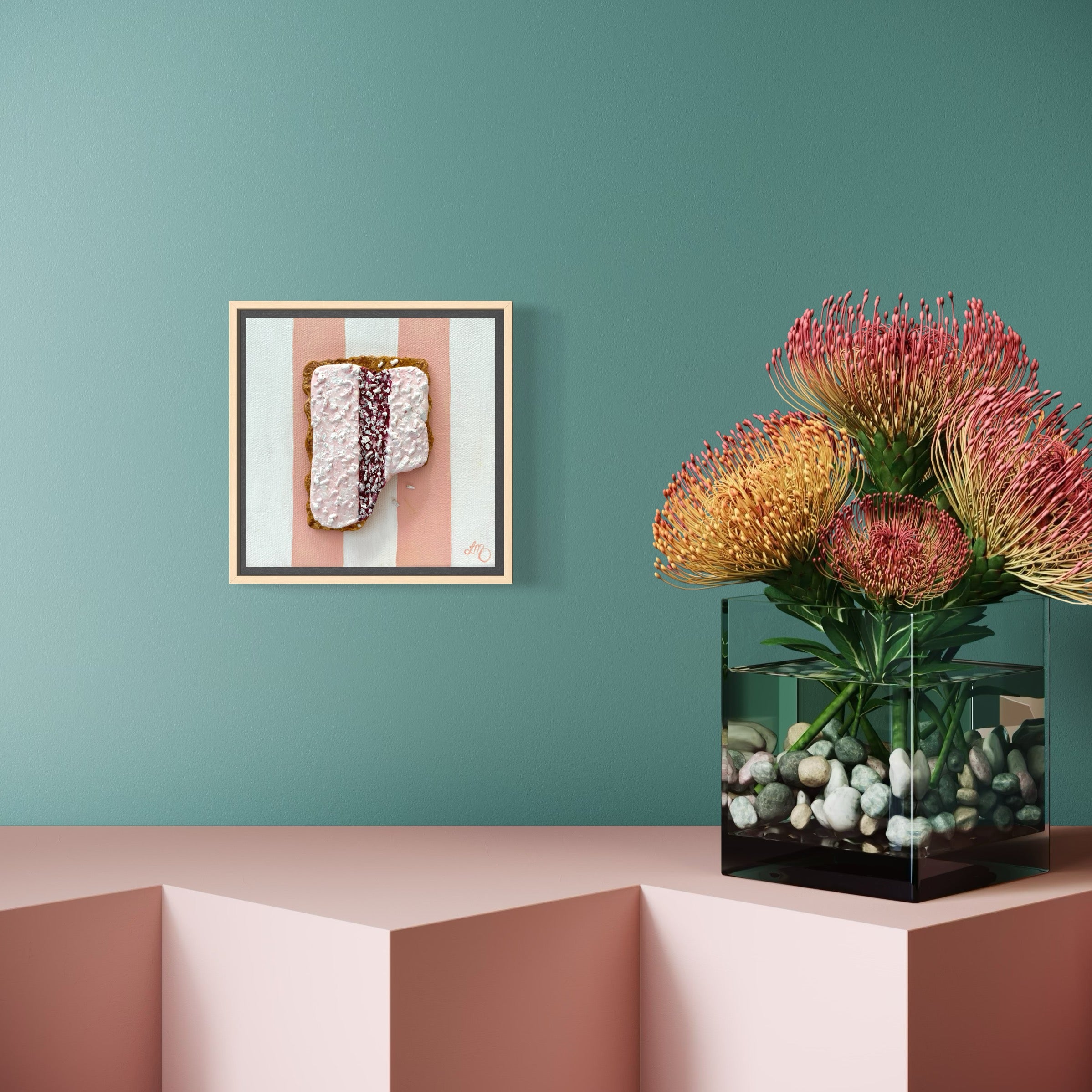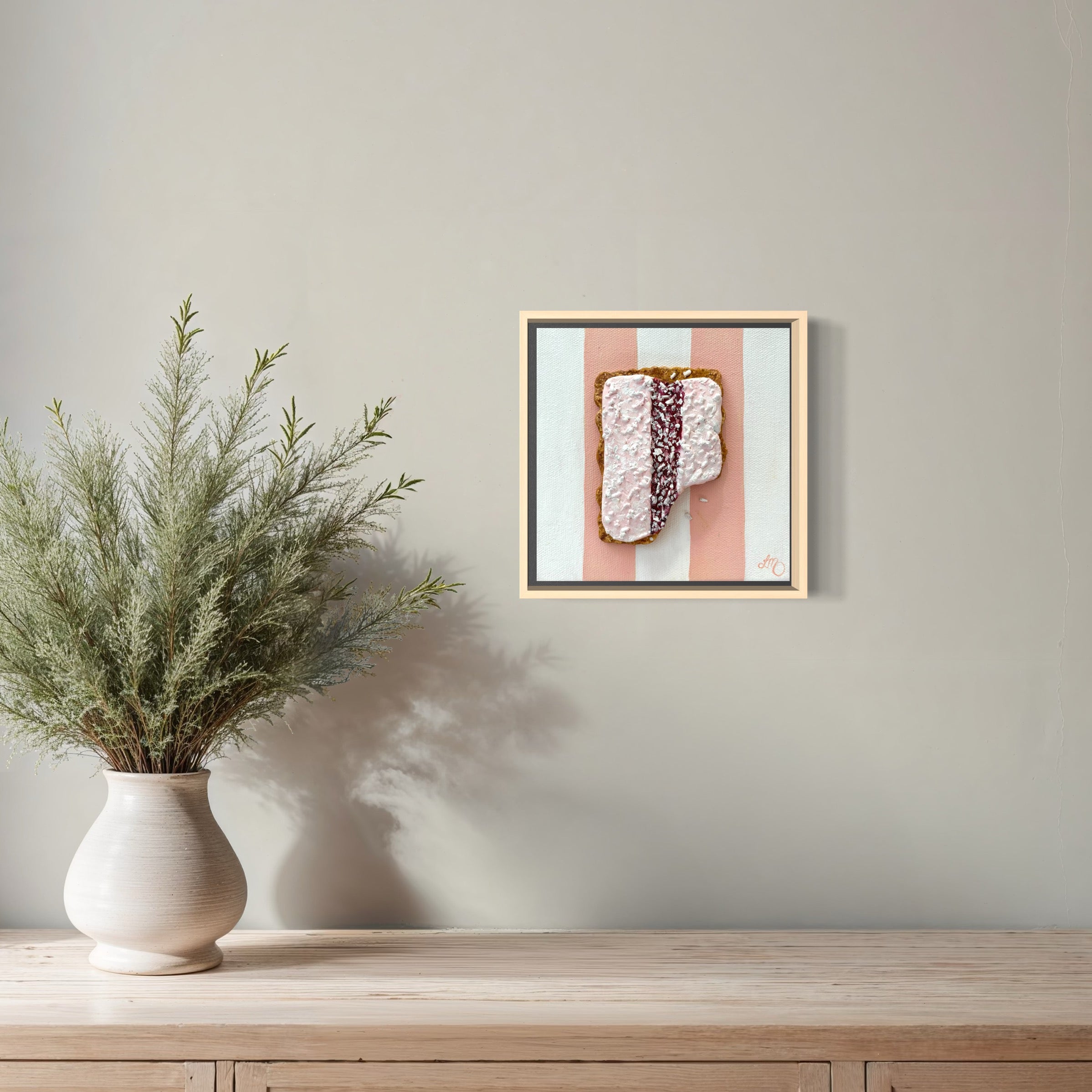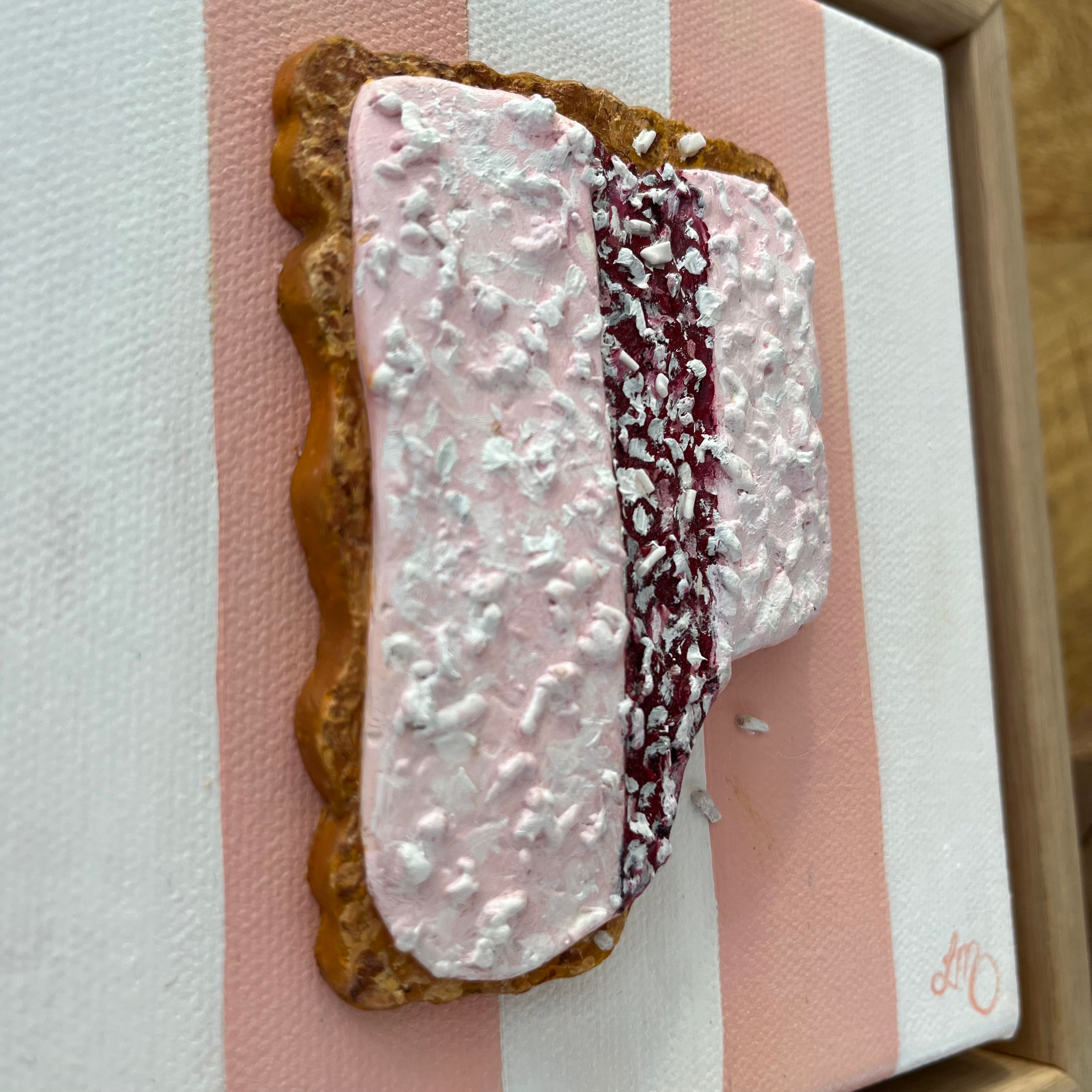 Sweet nostalgia meets playful texture in Iced Vovo Crush — a creamy, pastel-hued homage to the iconic Aussie bikkie. Swirls of strawberry, icing, and coconut come to life in luscious oil paint over sculpted polymer clay. It’s deliciously nostalgic and joyfully tactile.