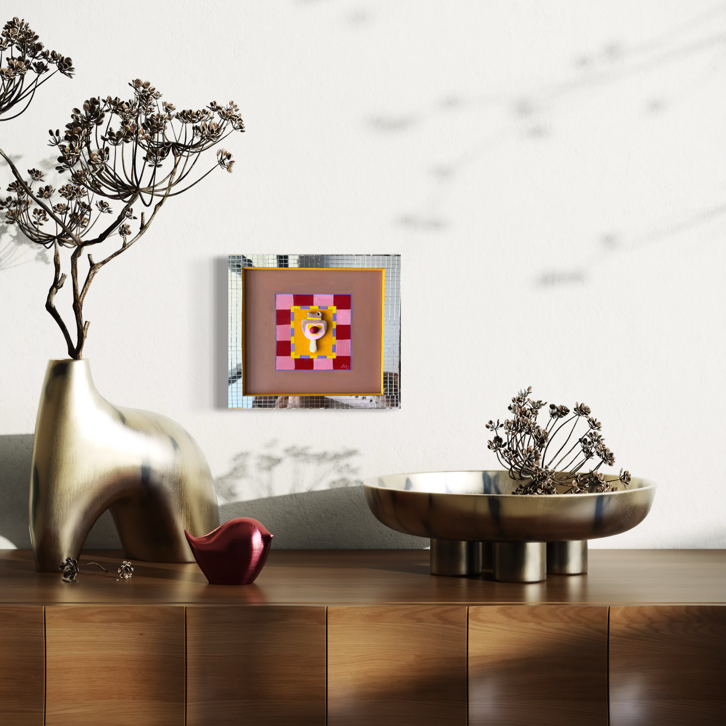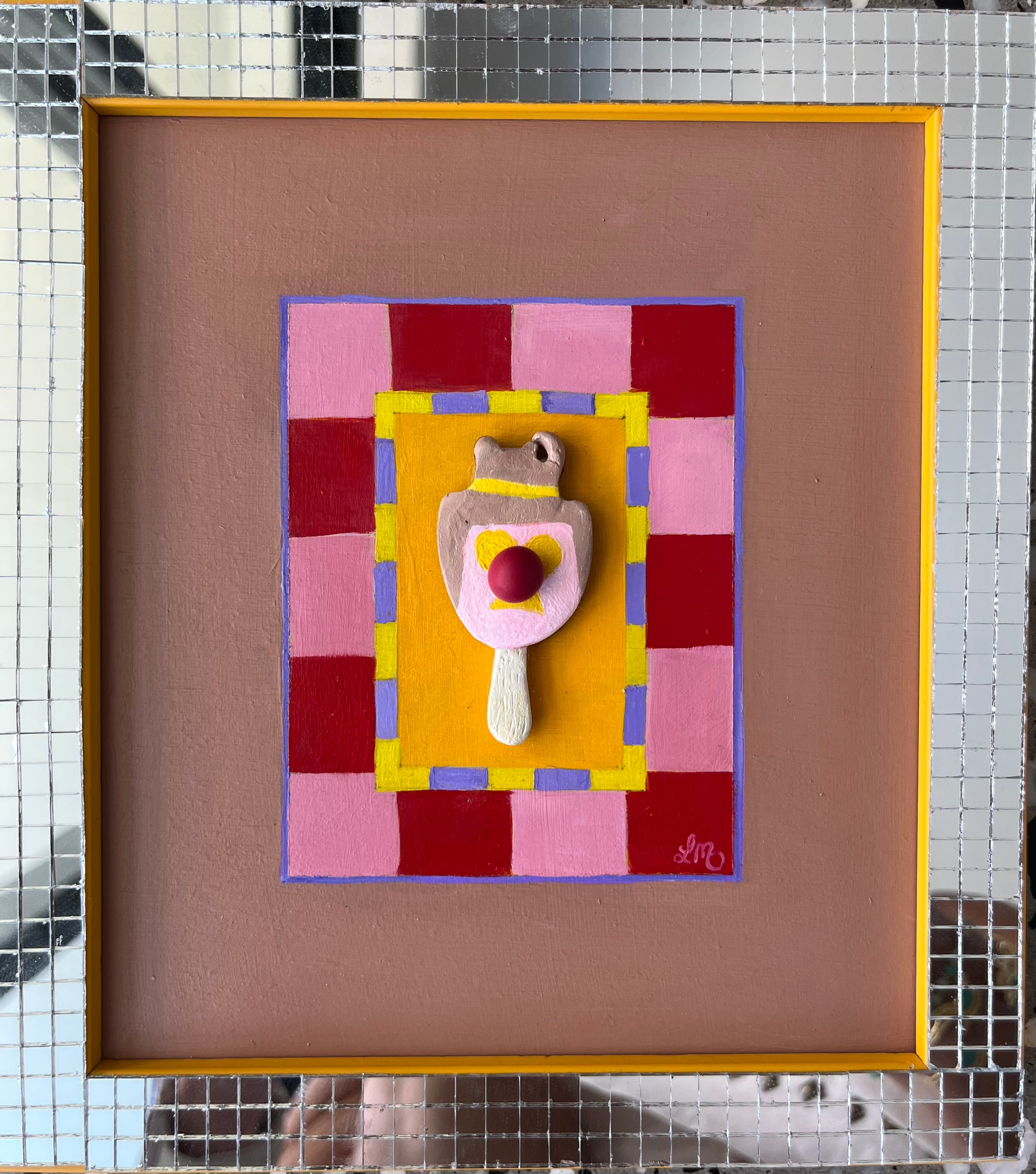 17 x 19cm | Oil and polymer clay on birch panel | Framed in Custom orange with mirrored mosaics | Ready to hang