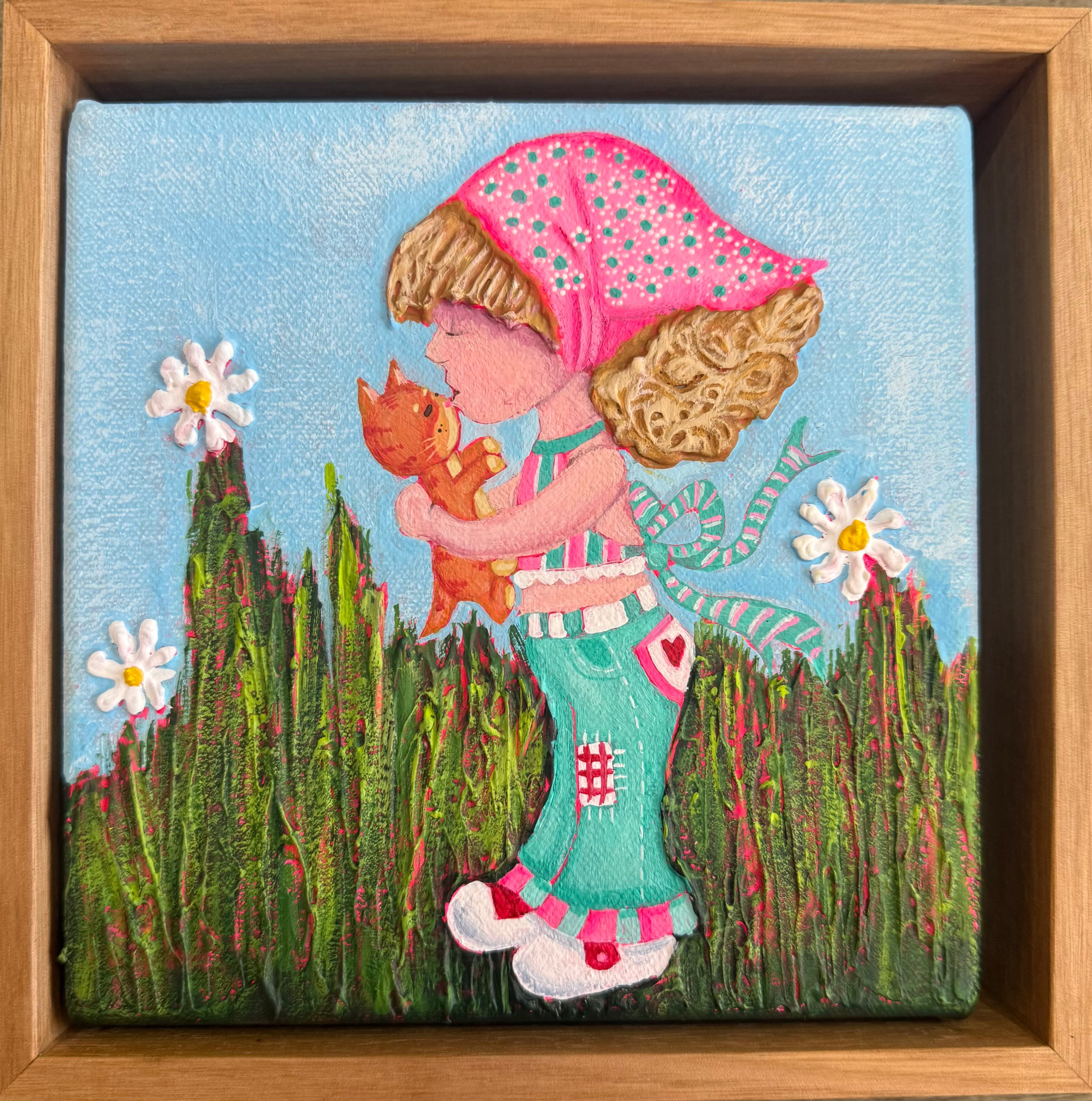 Little Kitty is painted capturing a vintage style with a twist of modern texture. Celebrating the simple things that give us joy.