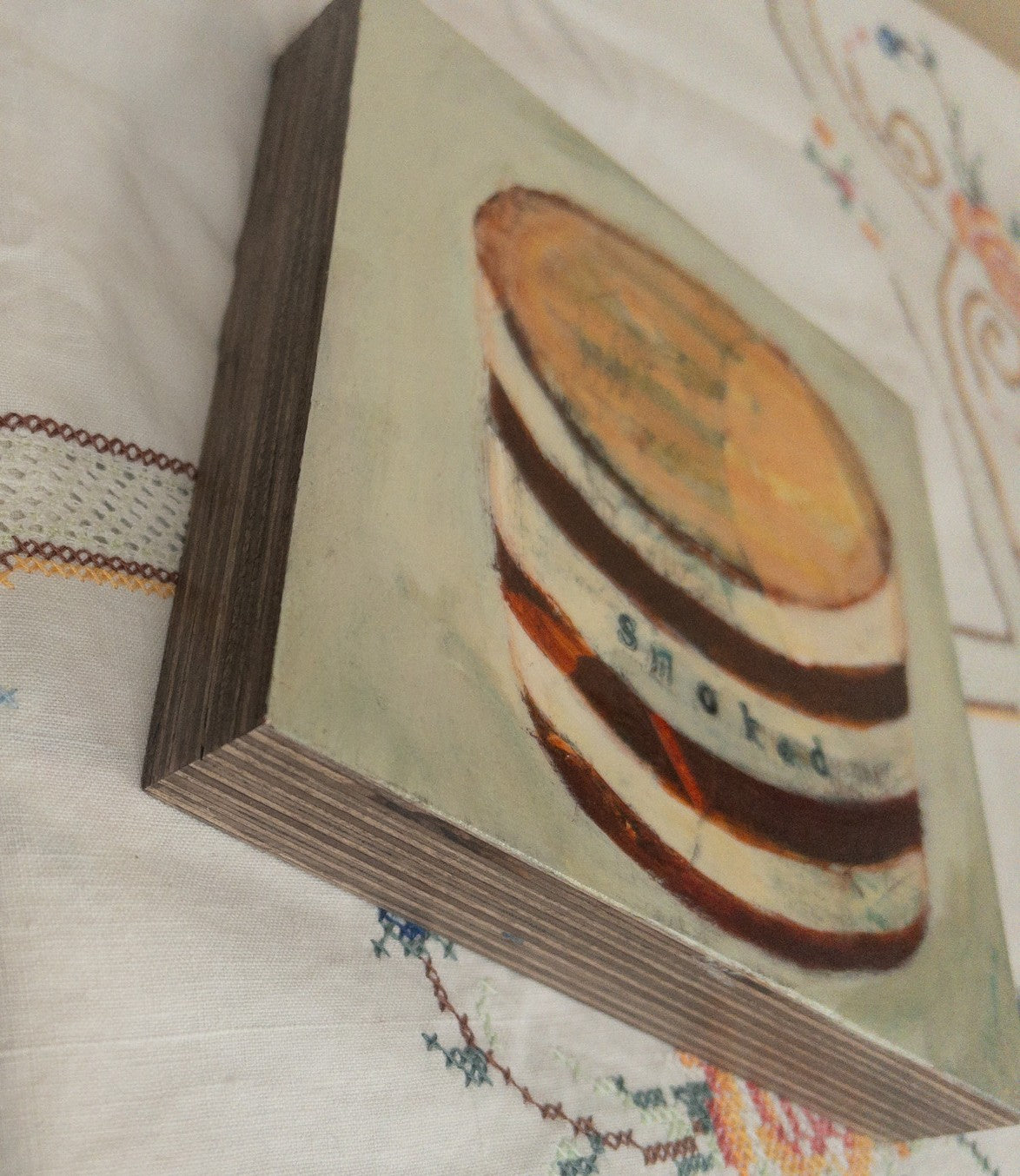 'Smoked' is a mixed media artwork from a series of mini standing paintings that depict familiar everyday objects, drawn from Lisa's larger tablescapes. 'Smoked', is a quirky depiction of a Smoked Salt cannister, and is a companion piece to Lisa's 'Sea' salt artwork.