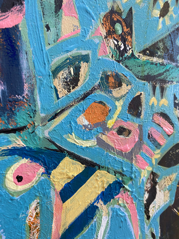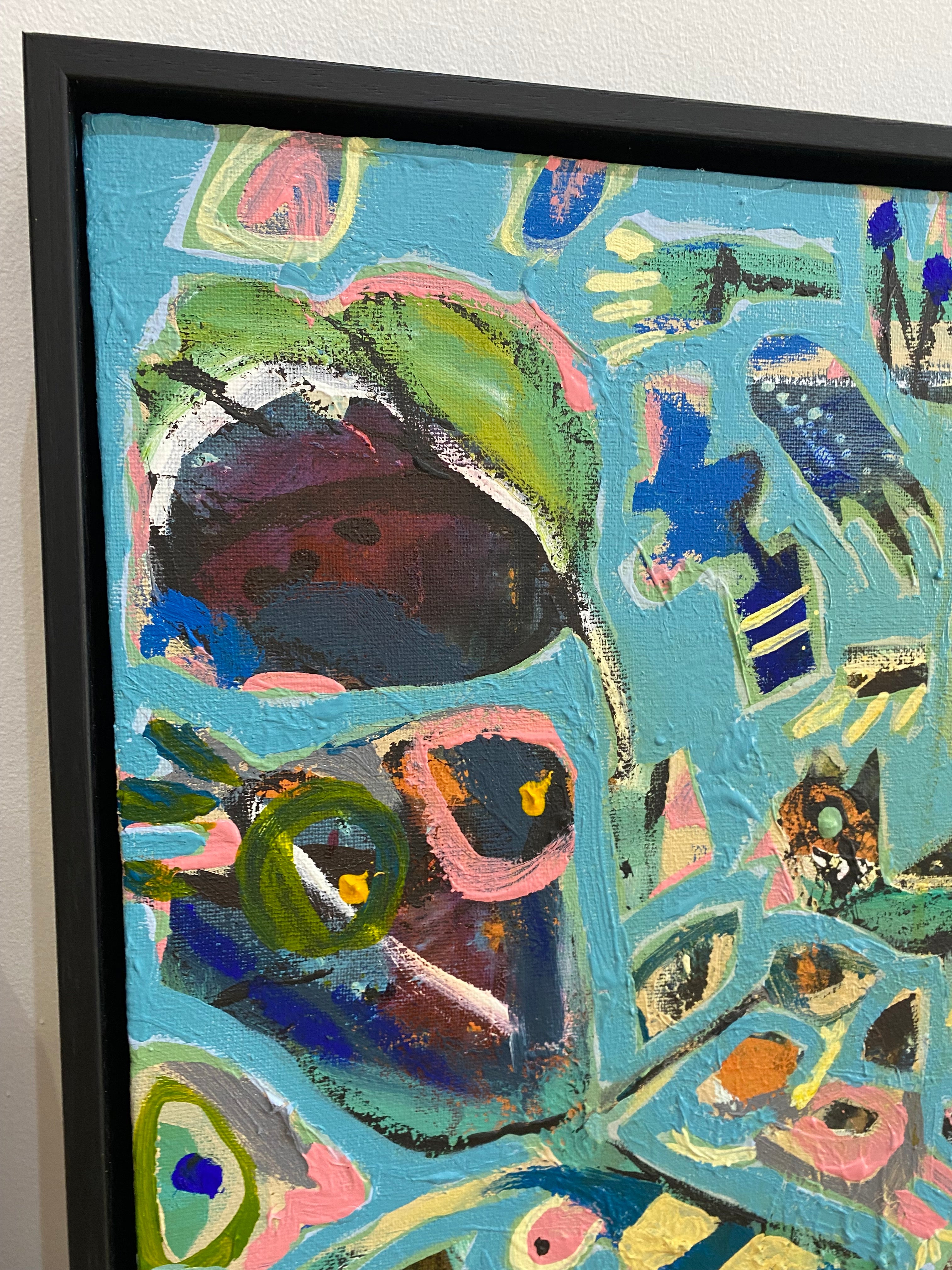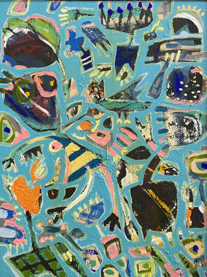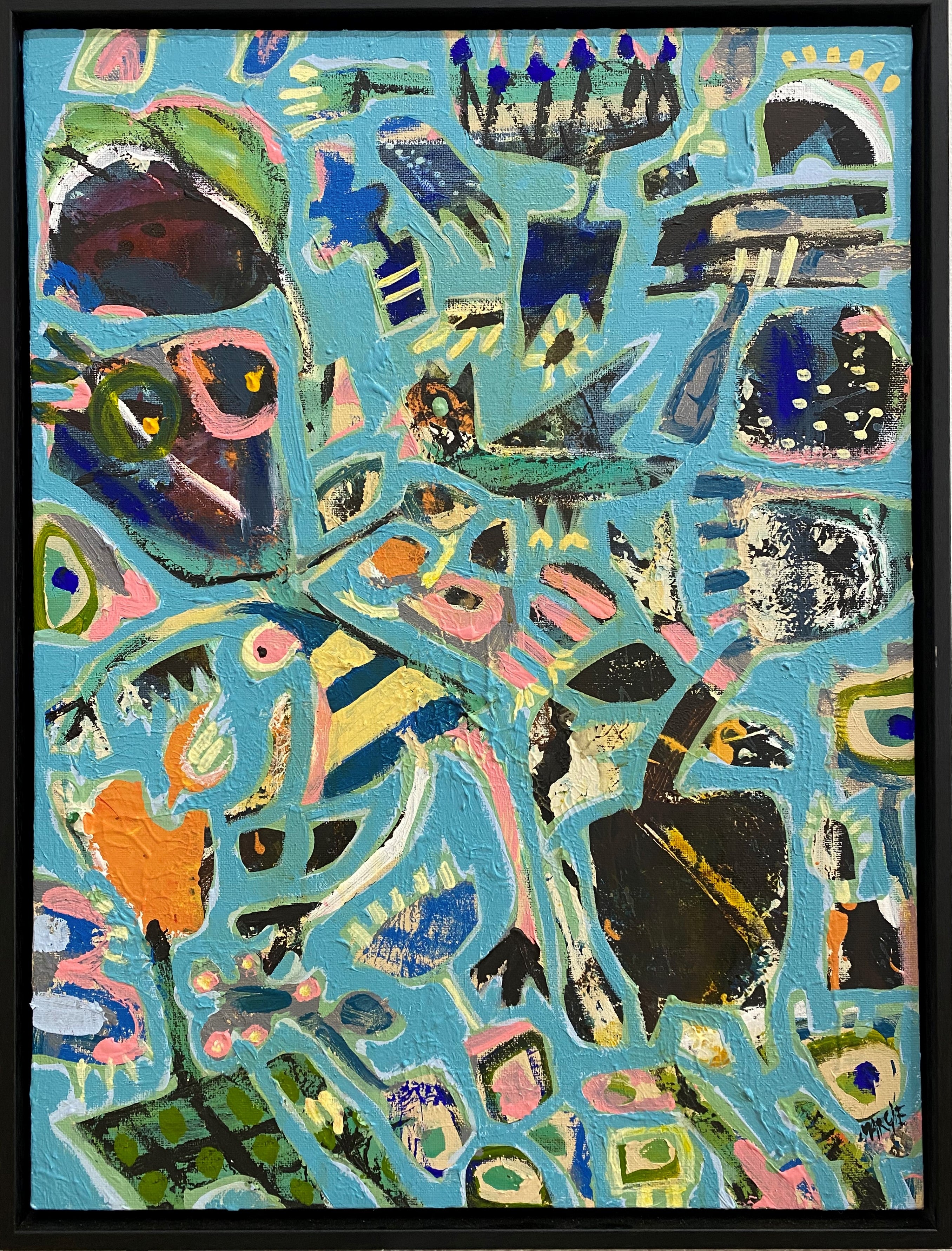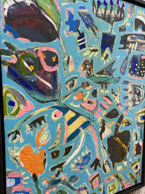 450 x 620cm. Acrylic paint, ink wash and oil sticks with conte drawing lines on canvas, framed in American oak a sustainable timber.