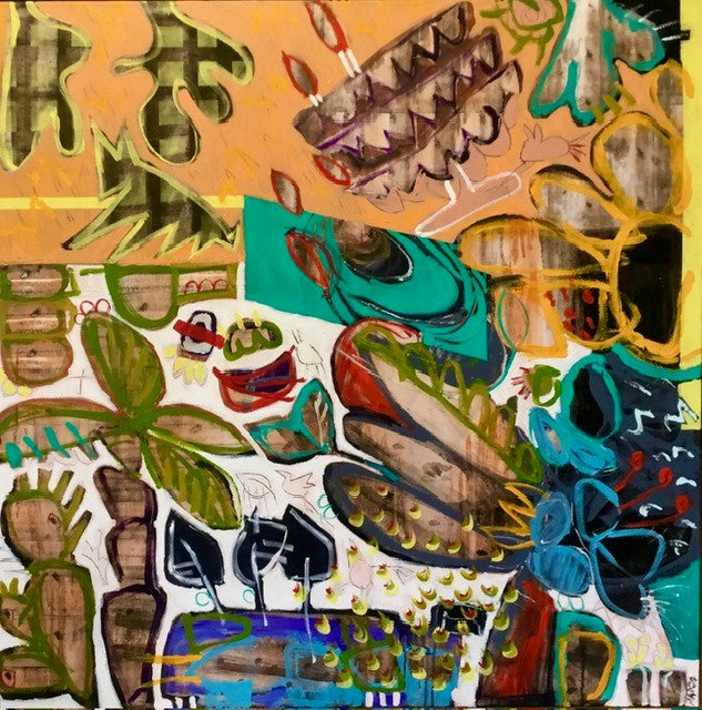 123 x 123 cm Acrylic paint, oil pastel and oil stick on canvas framed in sustainable Oak timber