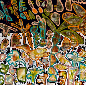 123 x 123 cm Acrylic paint, oil pastel and oil stick on canvas framed in sustainable Oak timber