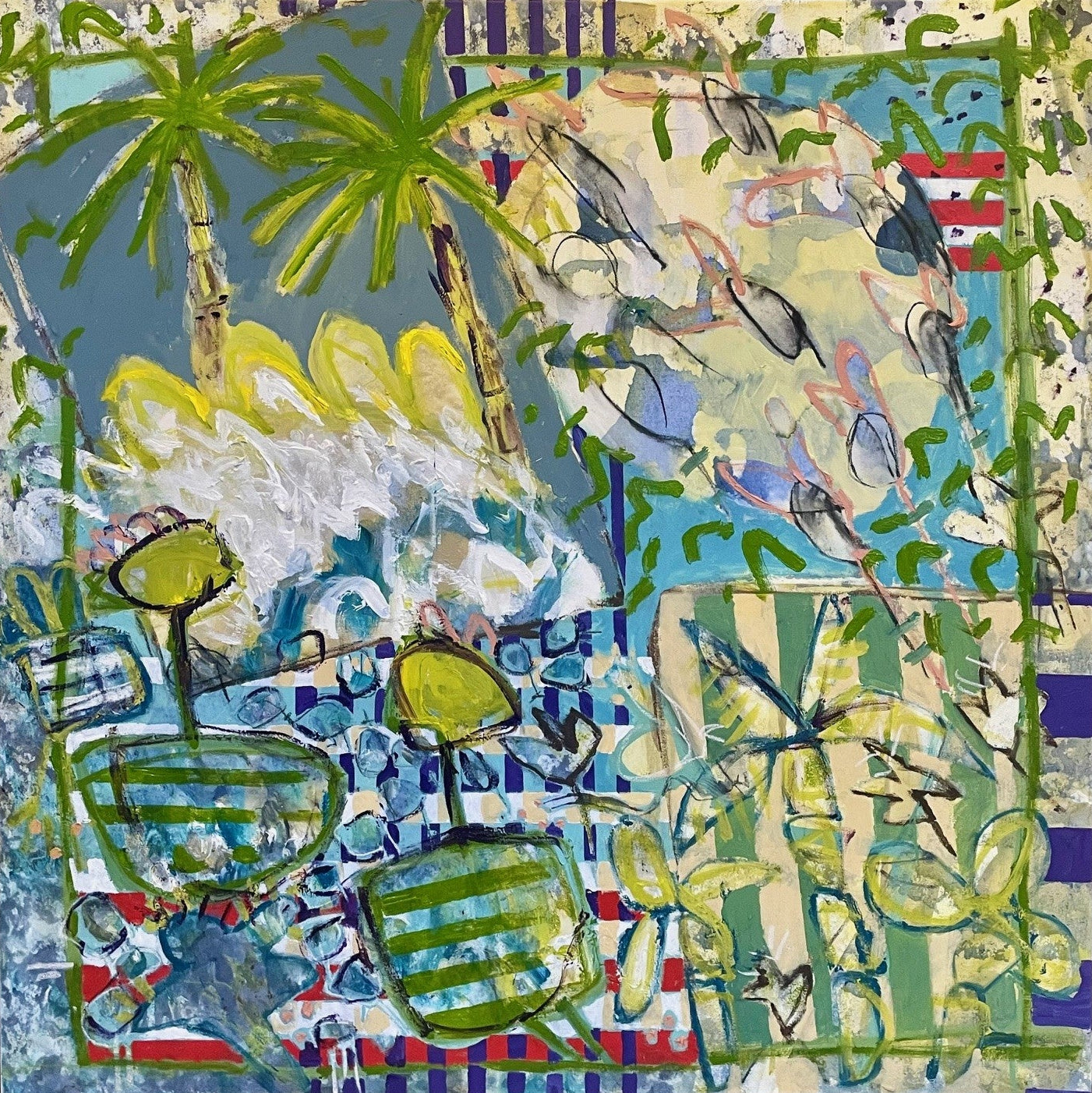 103 x 103cm. Acrylic paint, oil pastel, conte stick and food die on canvas, framed in timber.