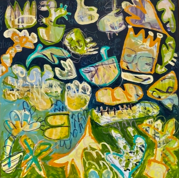 125 x 125cm. Acrylic paint, oil paint and oil pastel on canvas framed in sustainable timber.